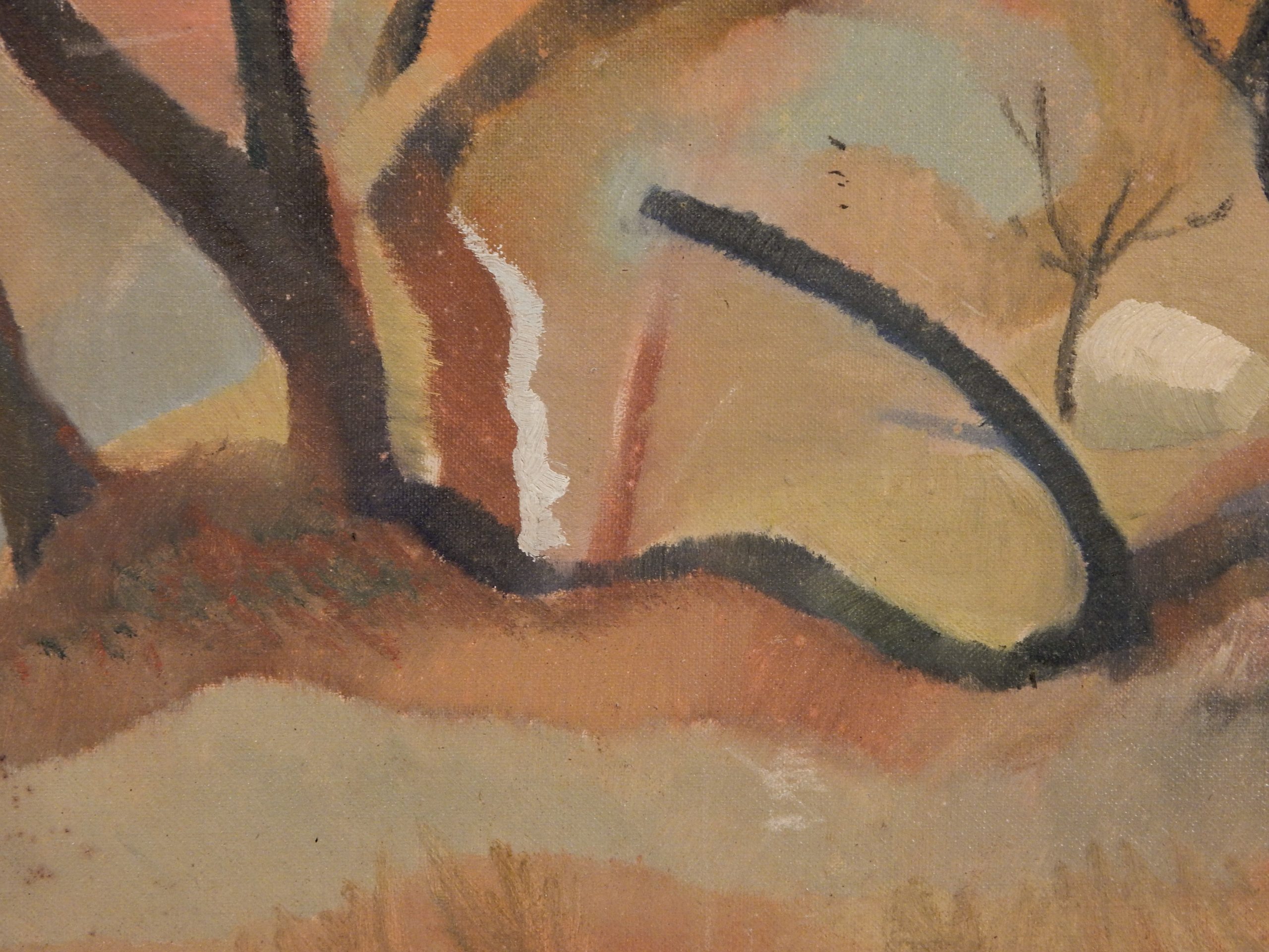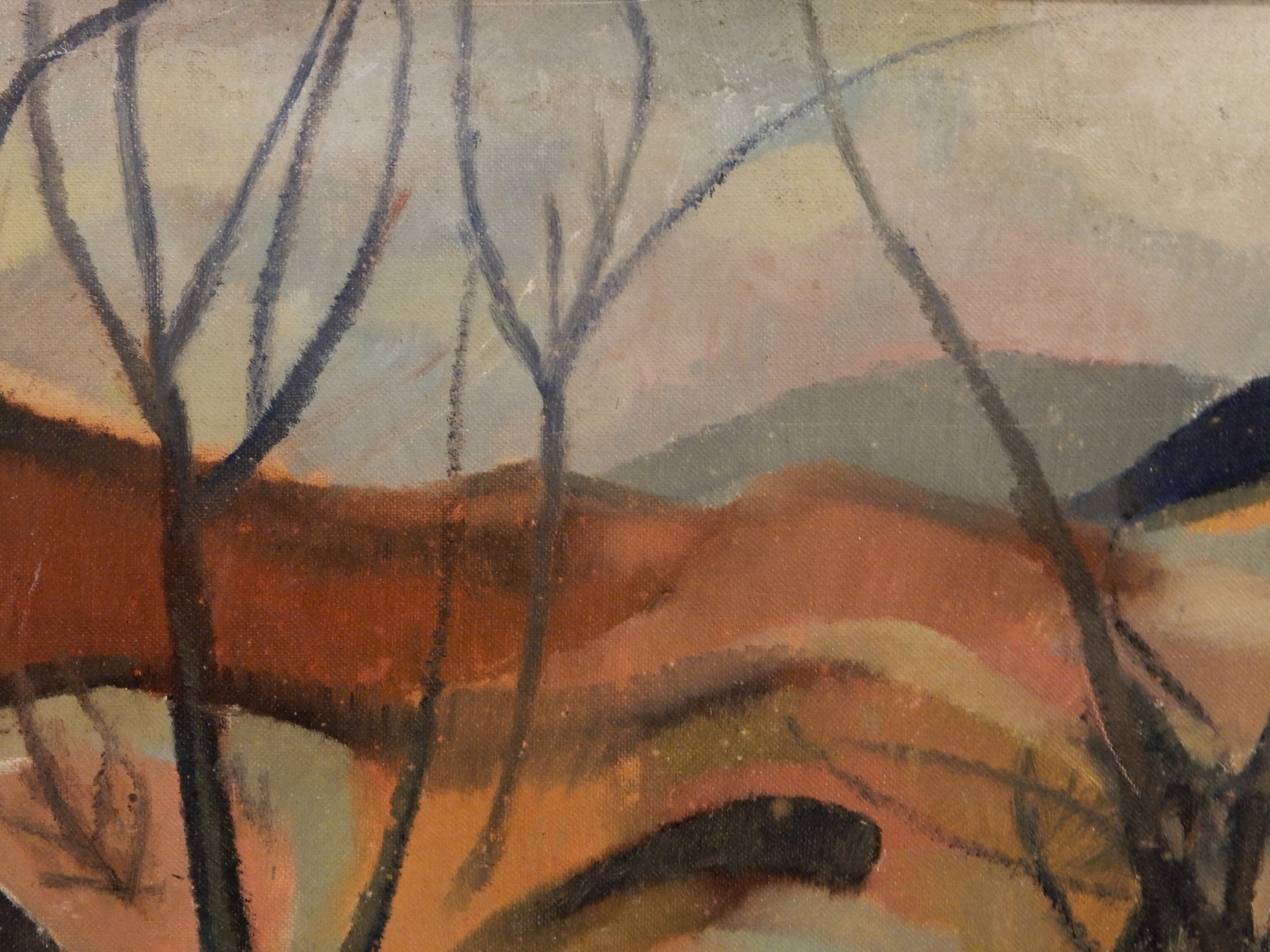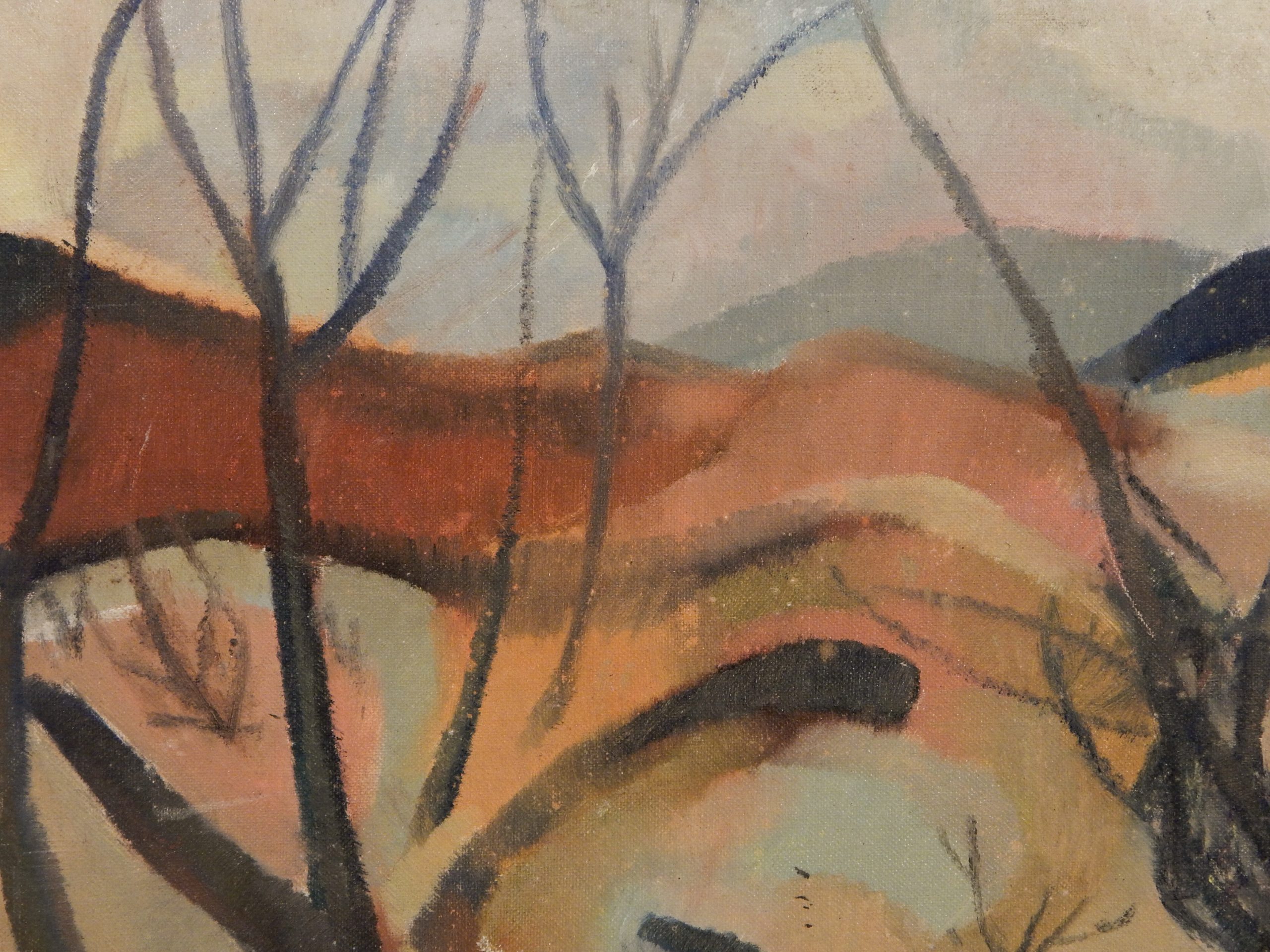 Modernist, Dreamlike Landscape of Mountains Beyond Trees in a Painted Wood Frame
