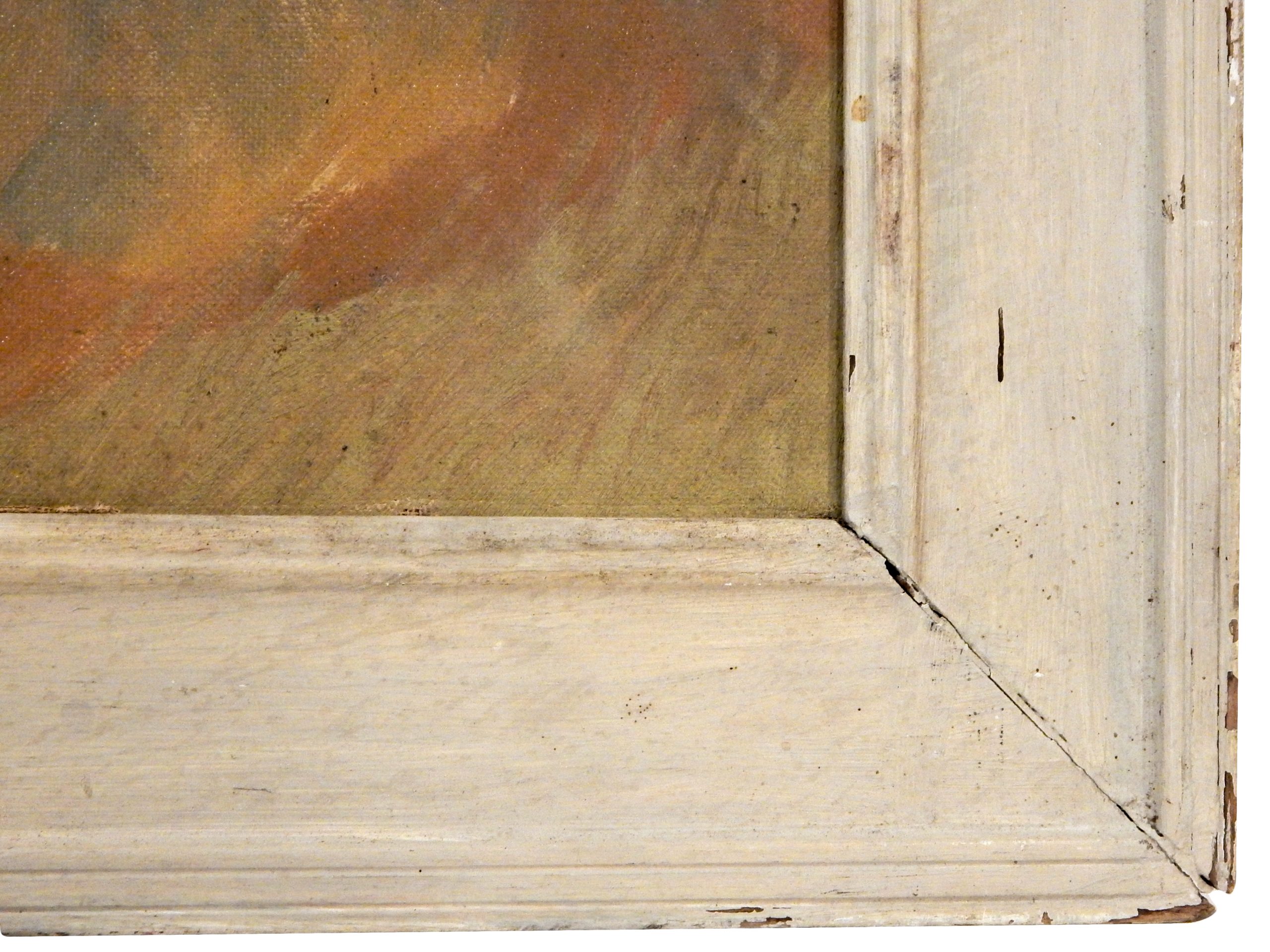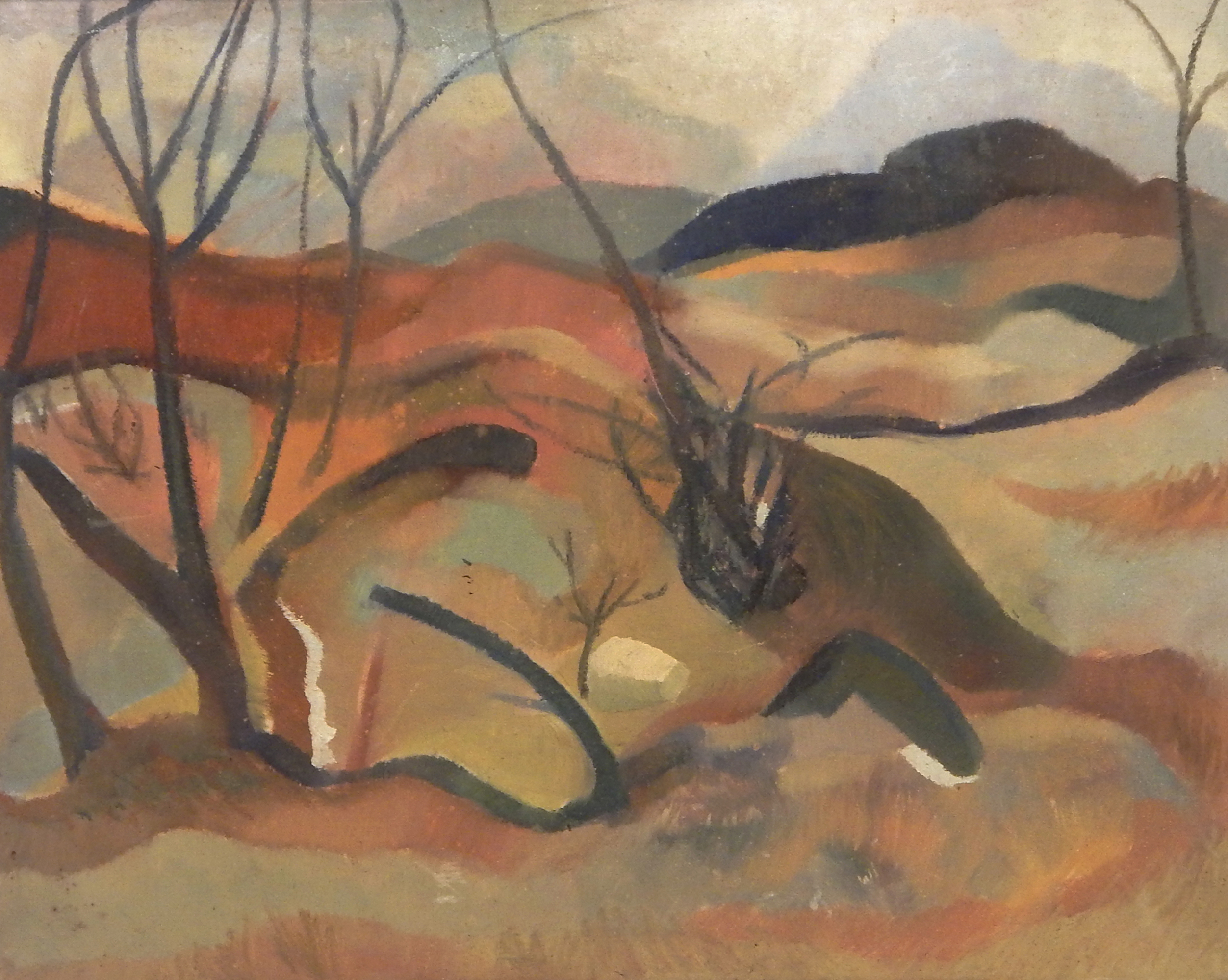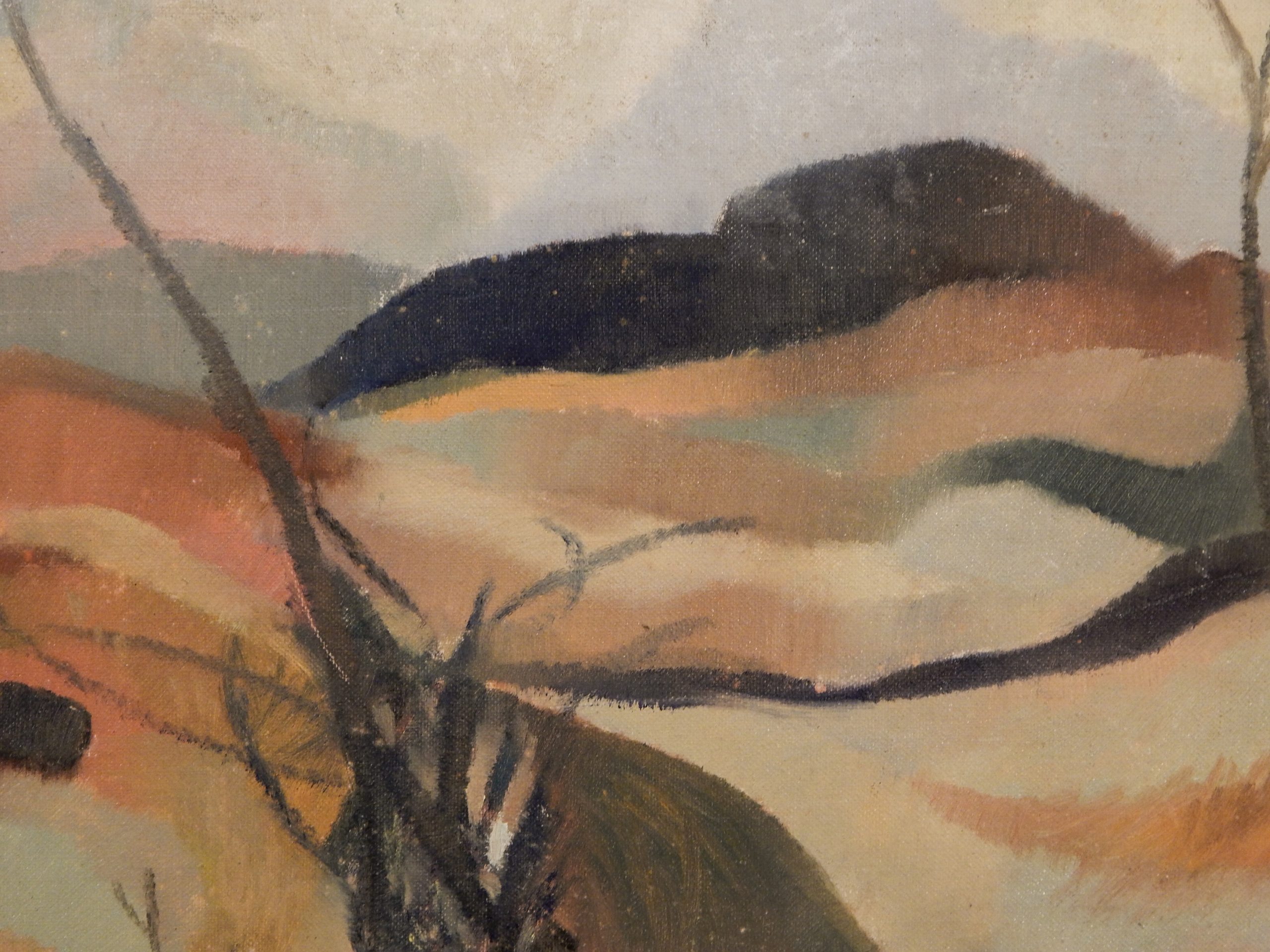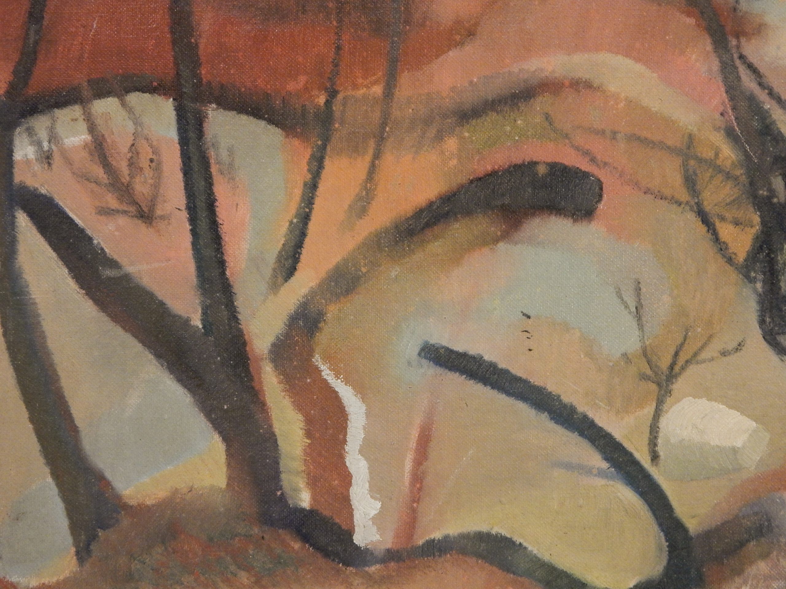 Modernist, Dreamlike Landscape of Mountains Beyond Trees in a Painted Wood Frame