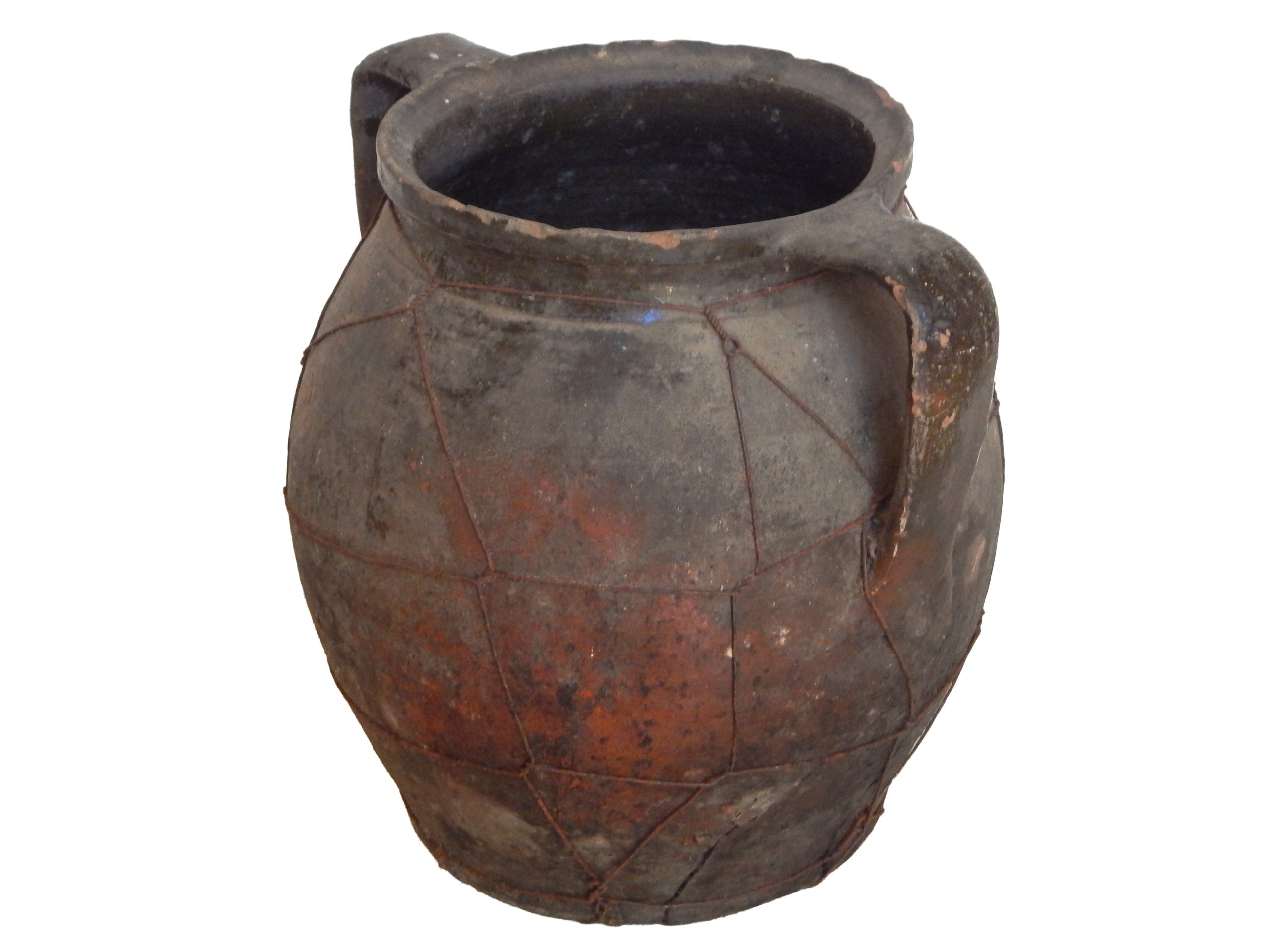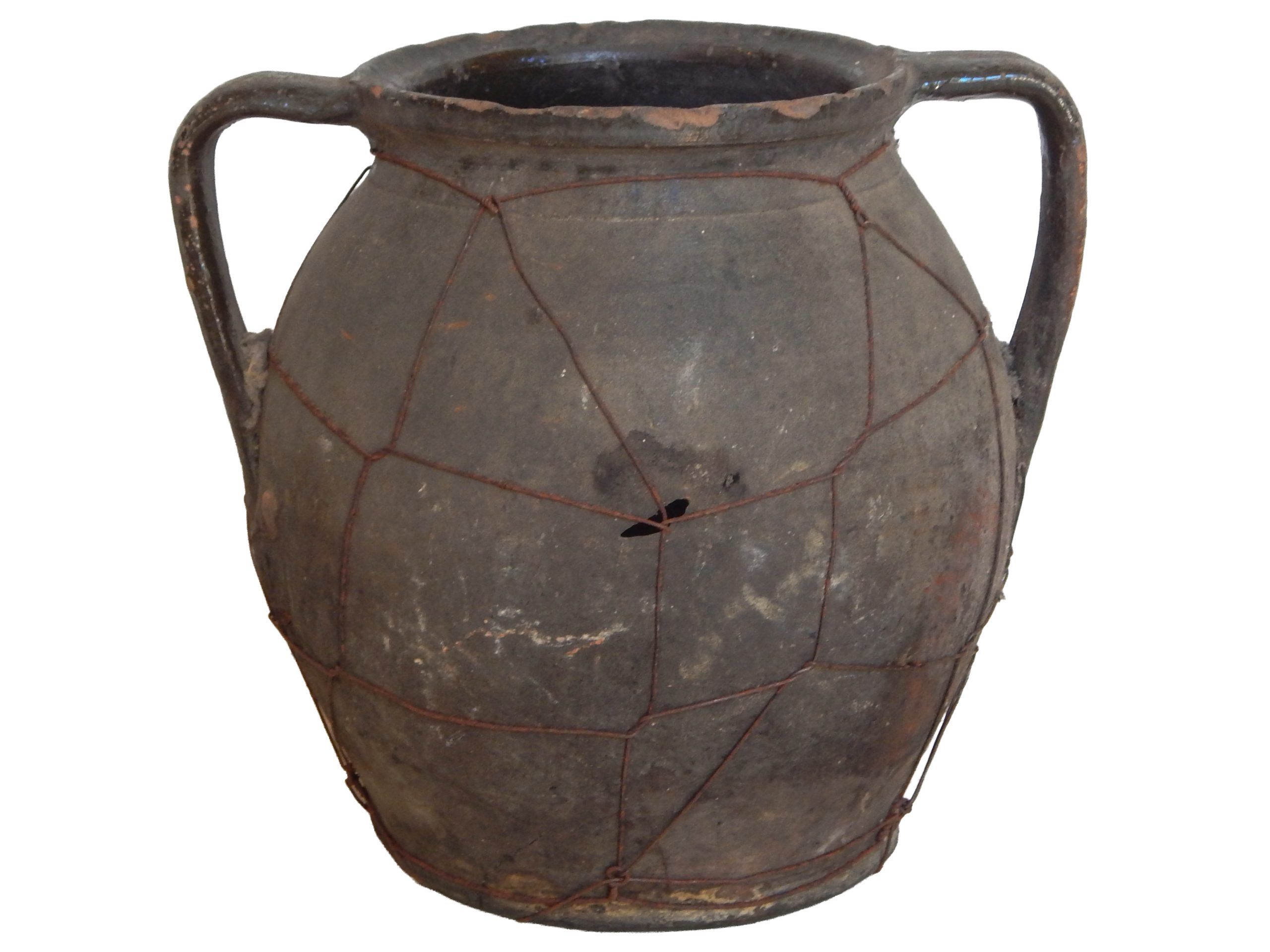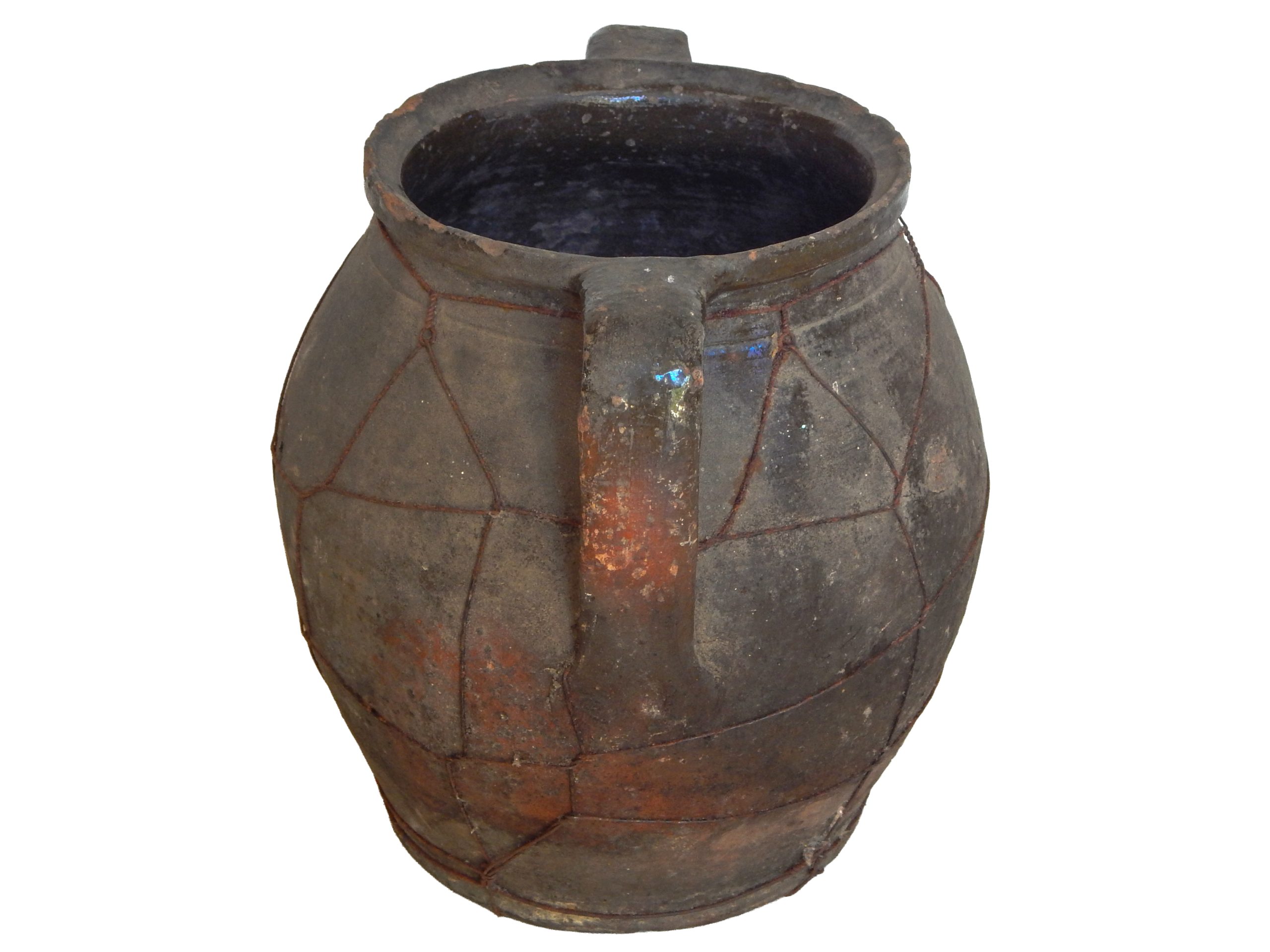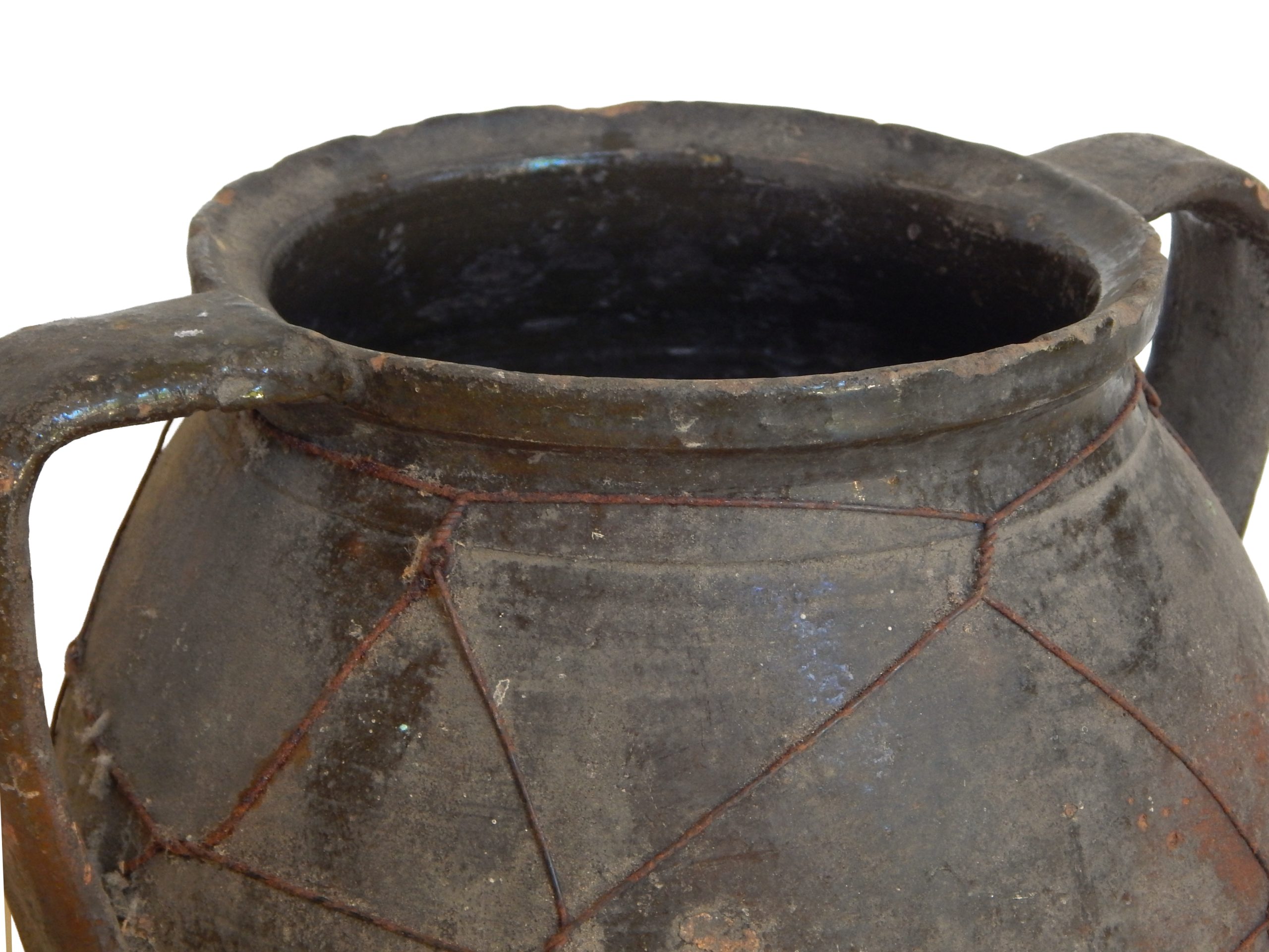 Early Turkish Double-Handled Vessel with Dark Glaze & Wiring Around Body