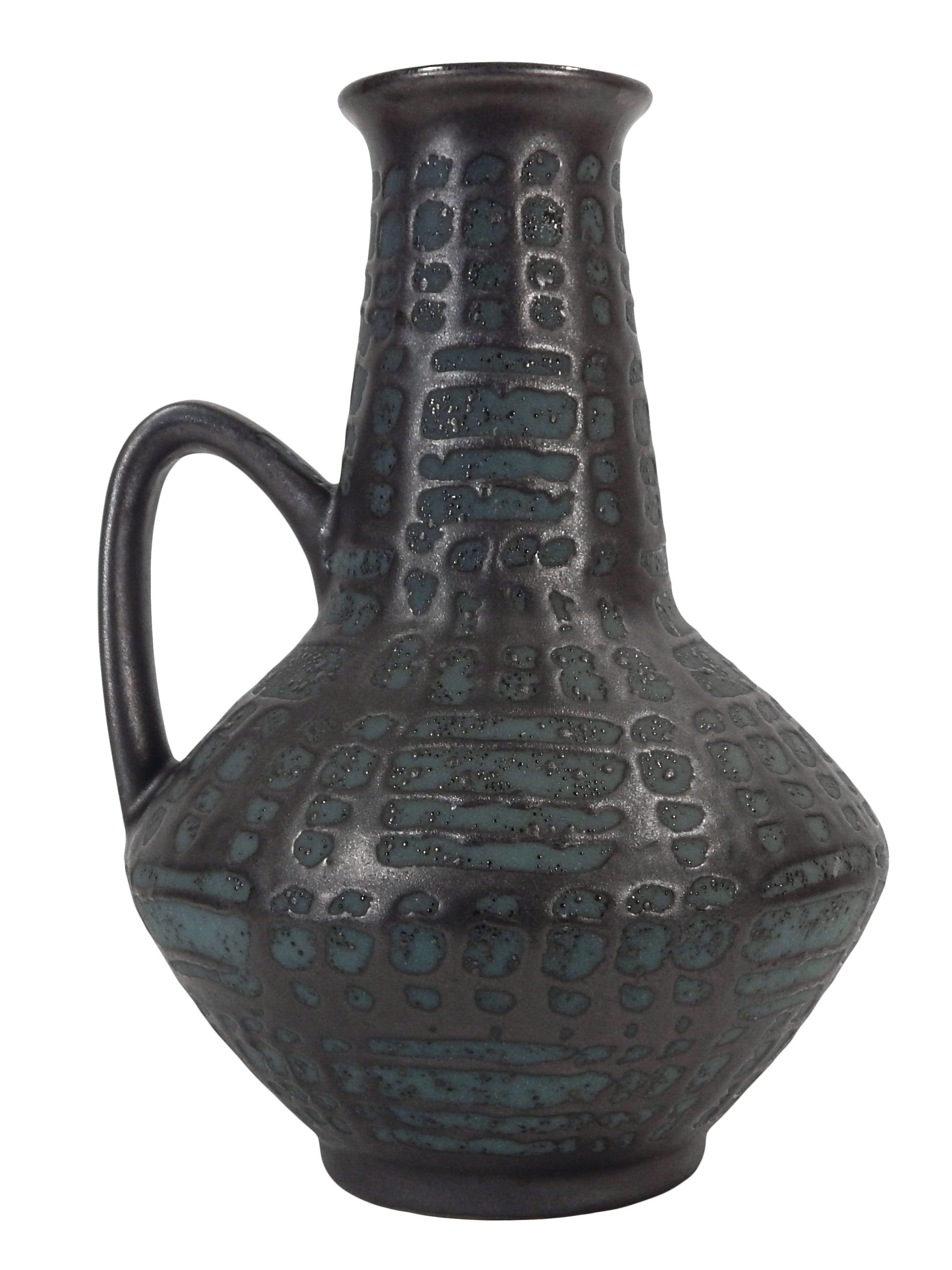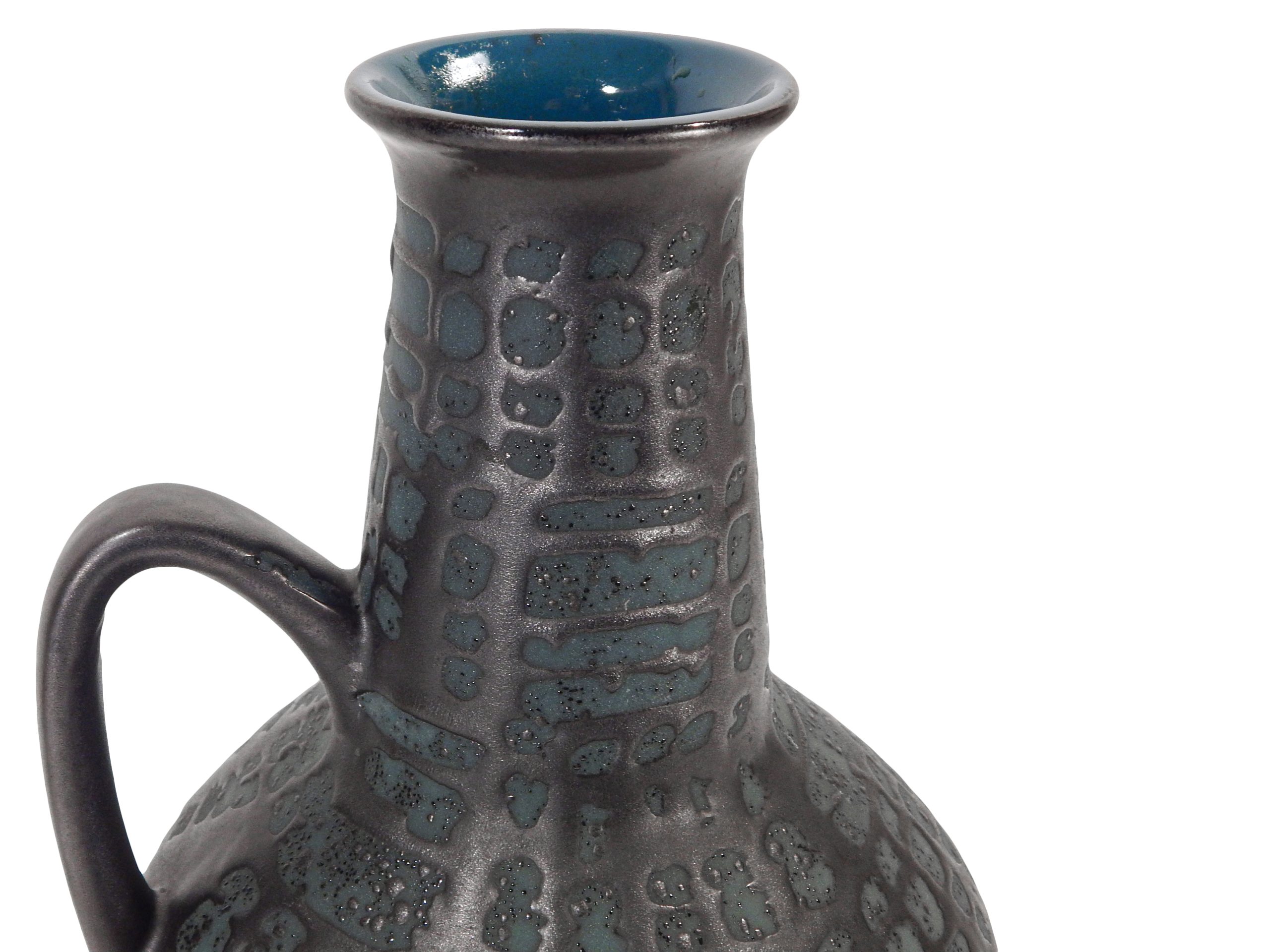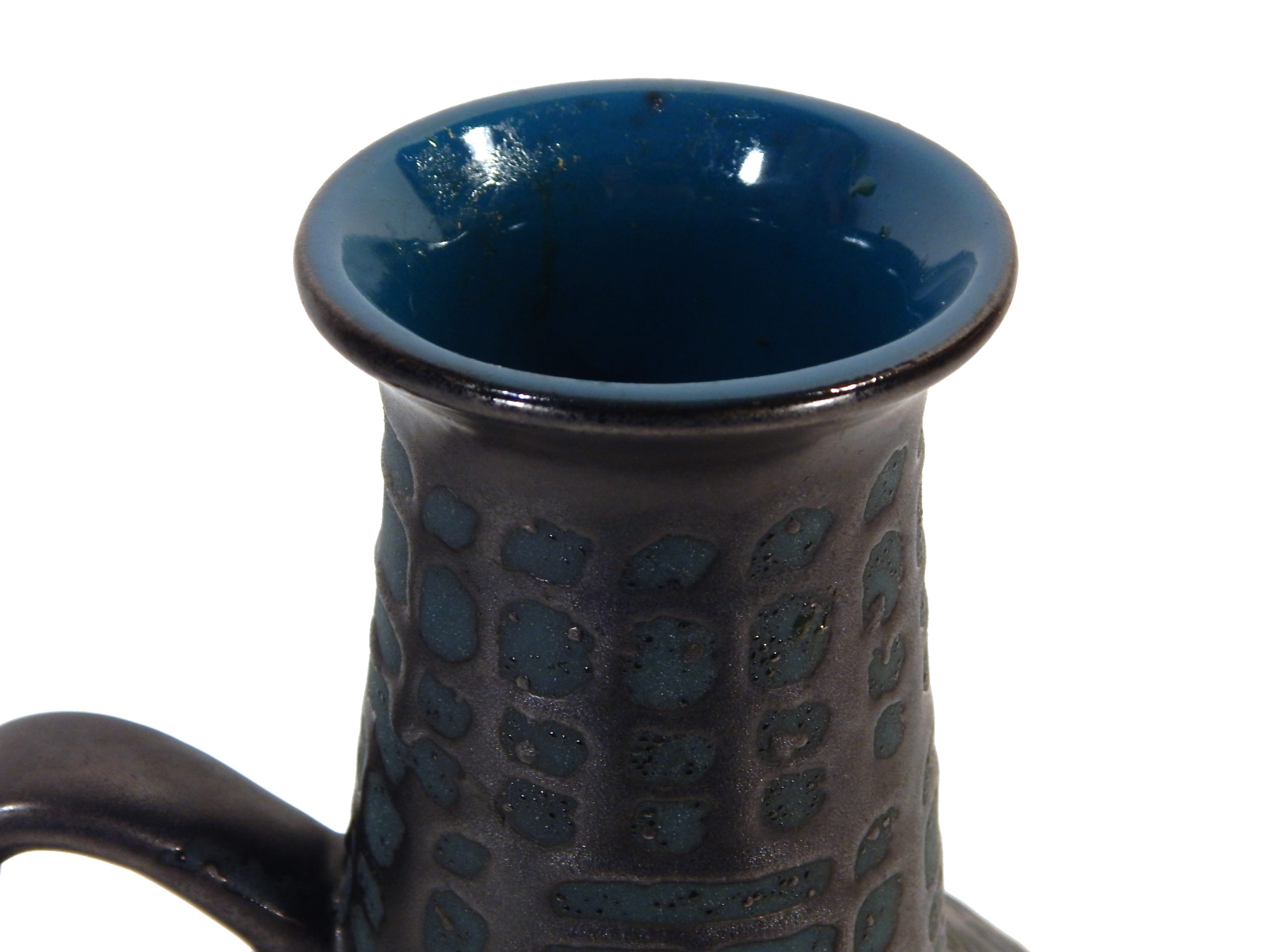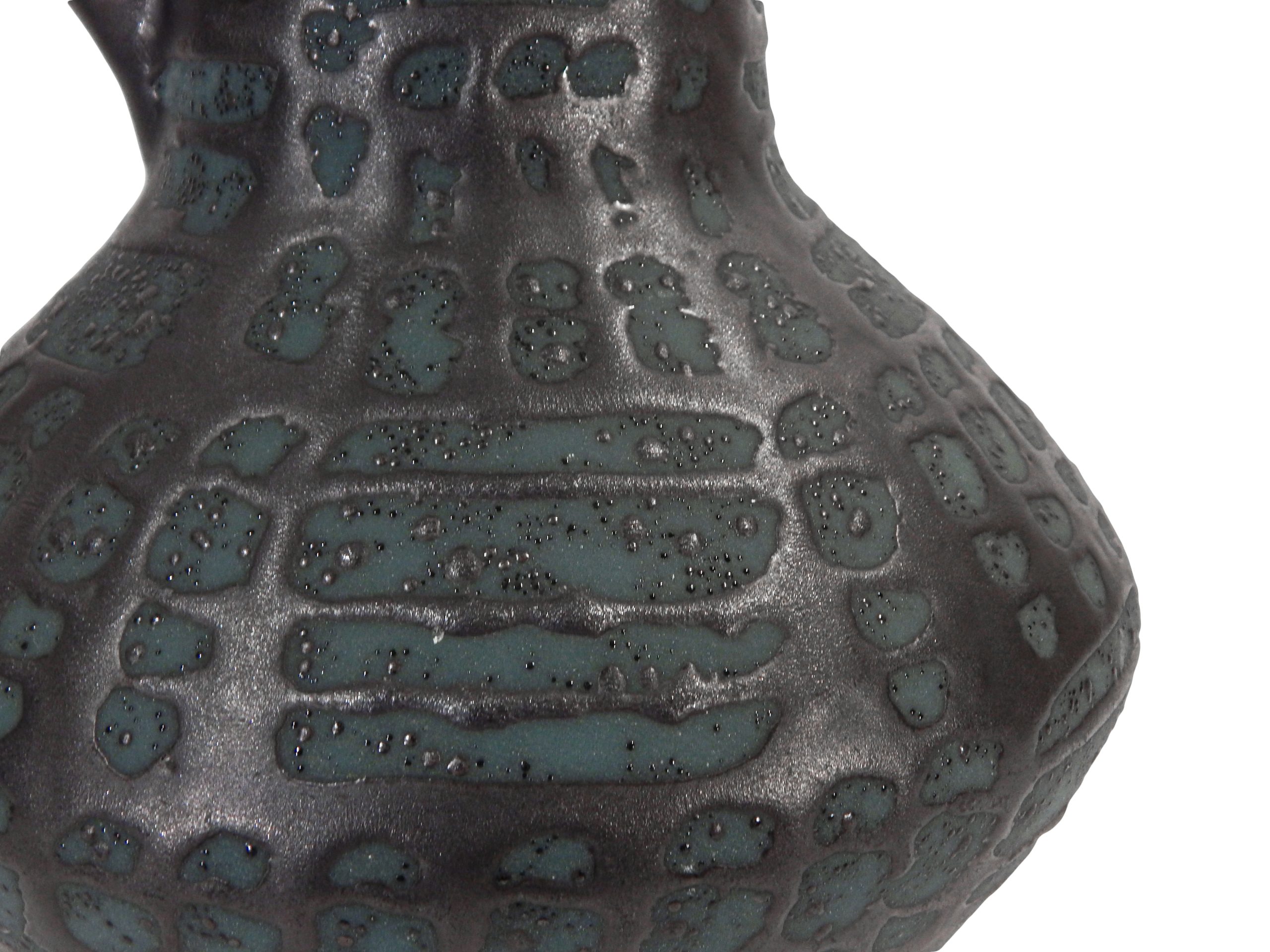Mid Century Carstens Tonnieshof Handled Vase with Patterened Black Metallic Glazing Over Deep Teal Matt Finish