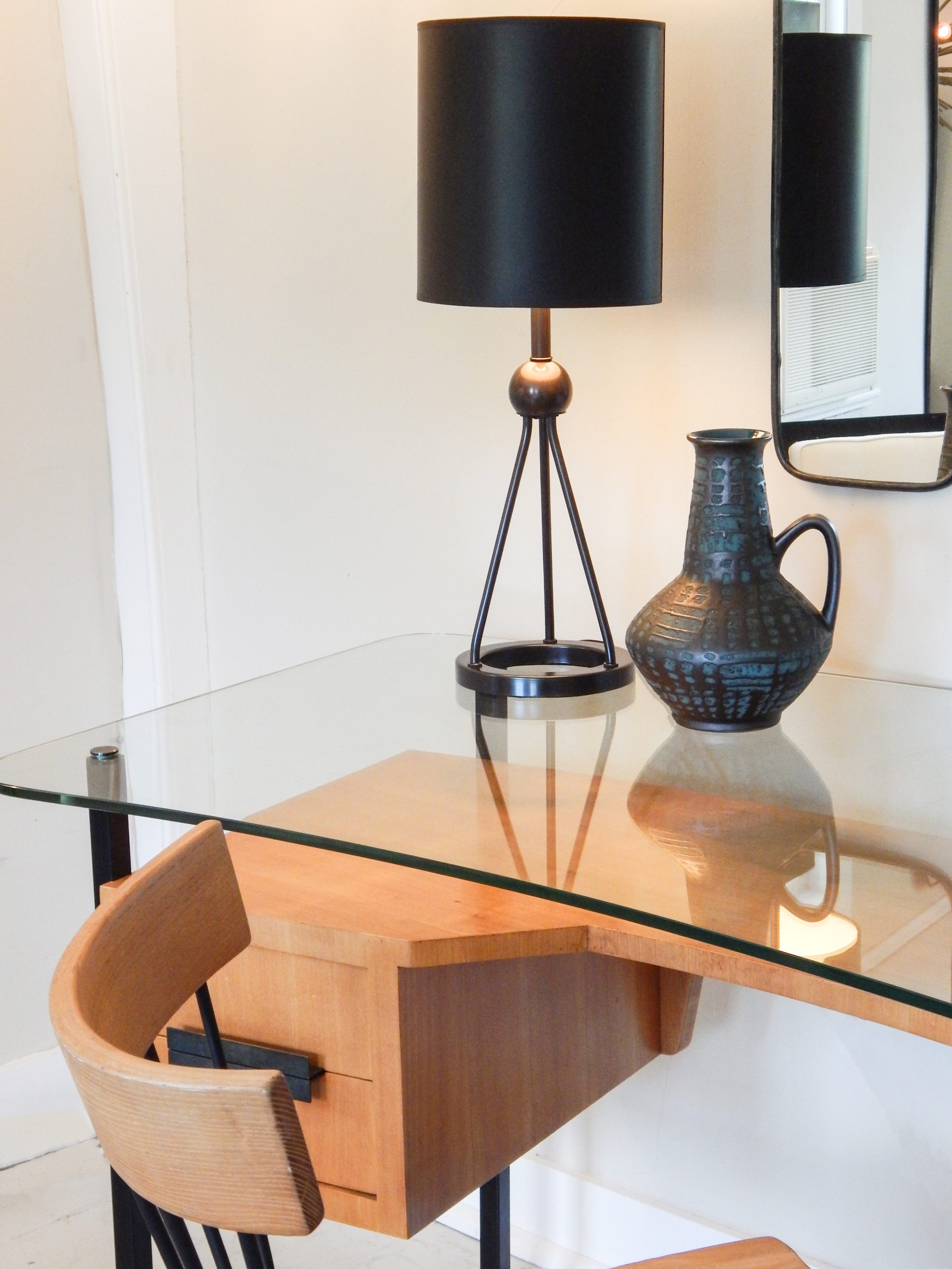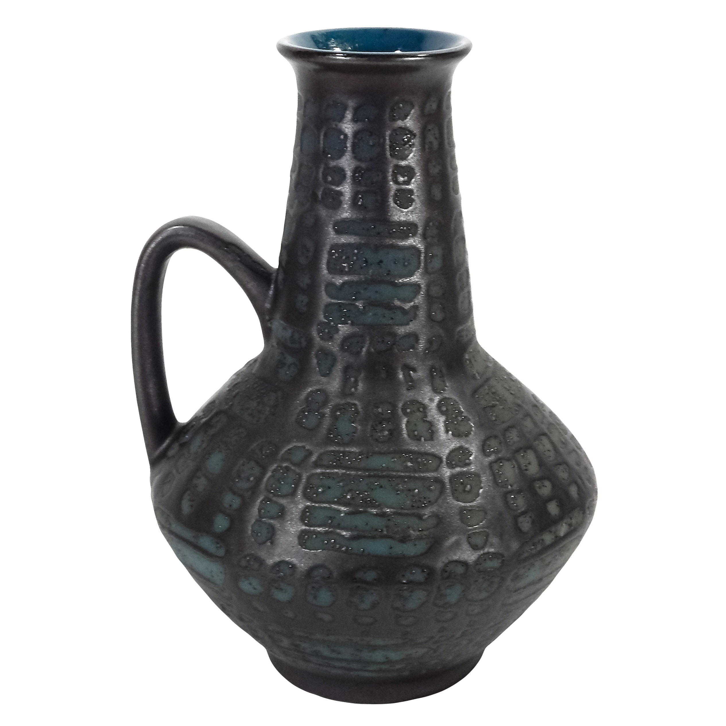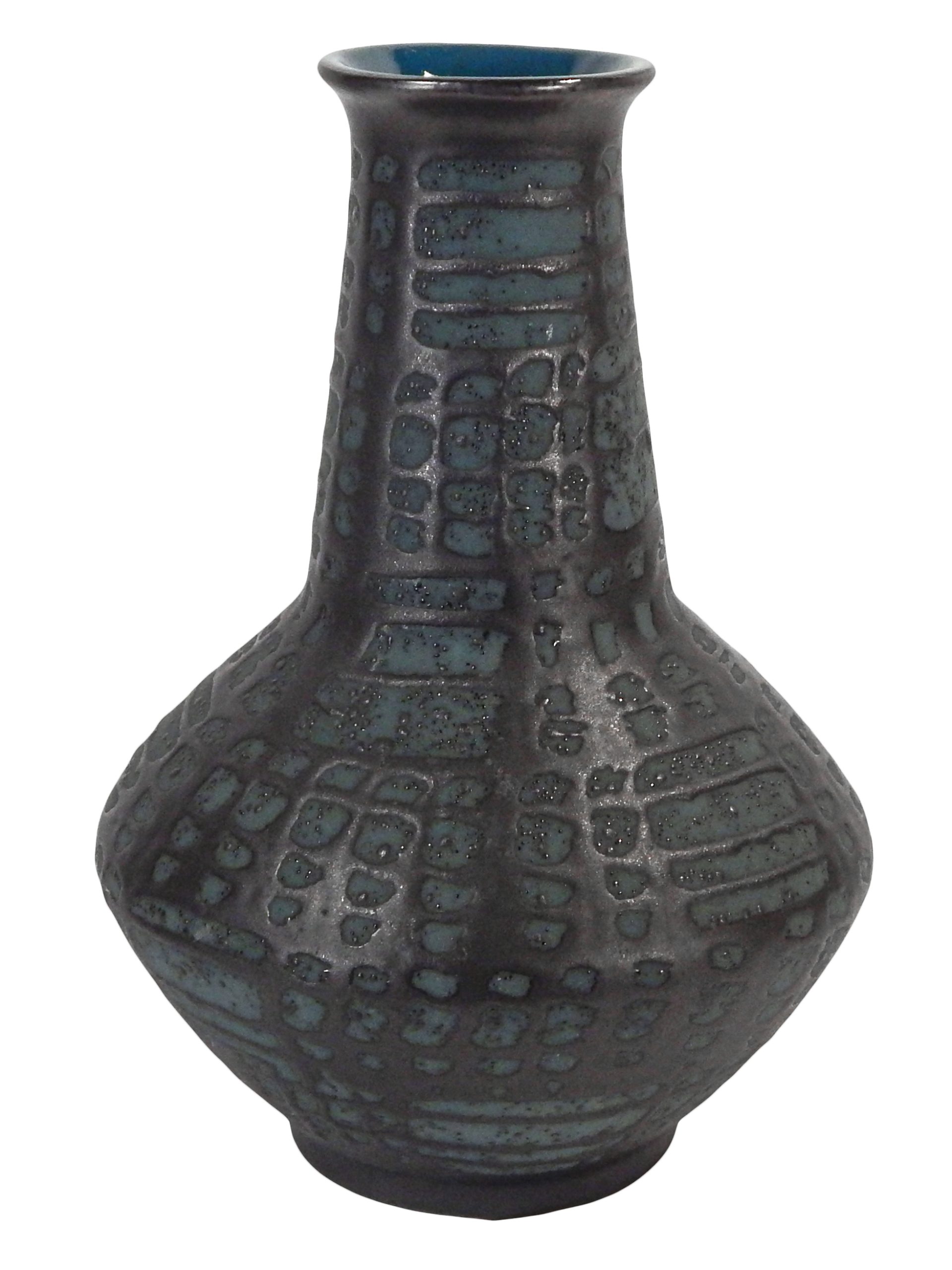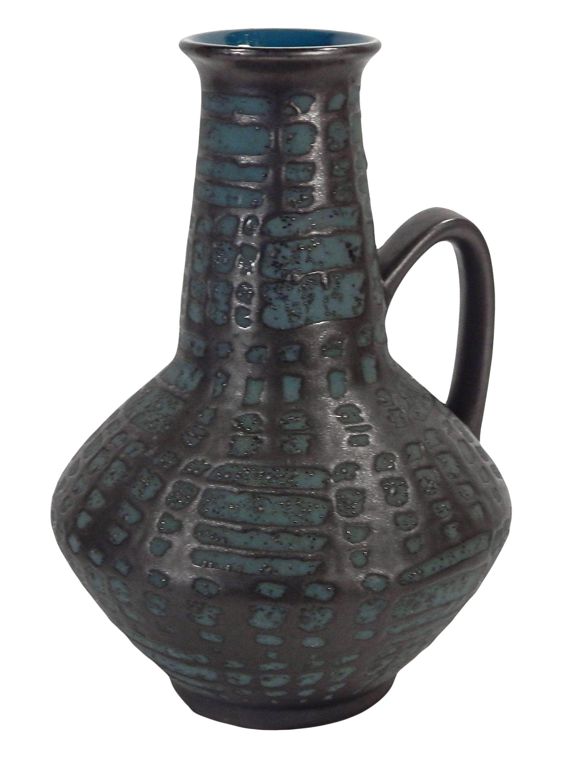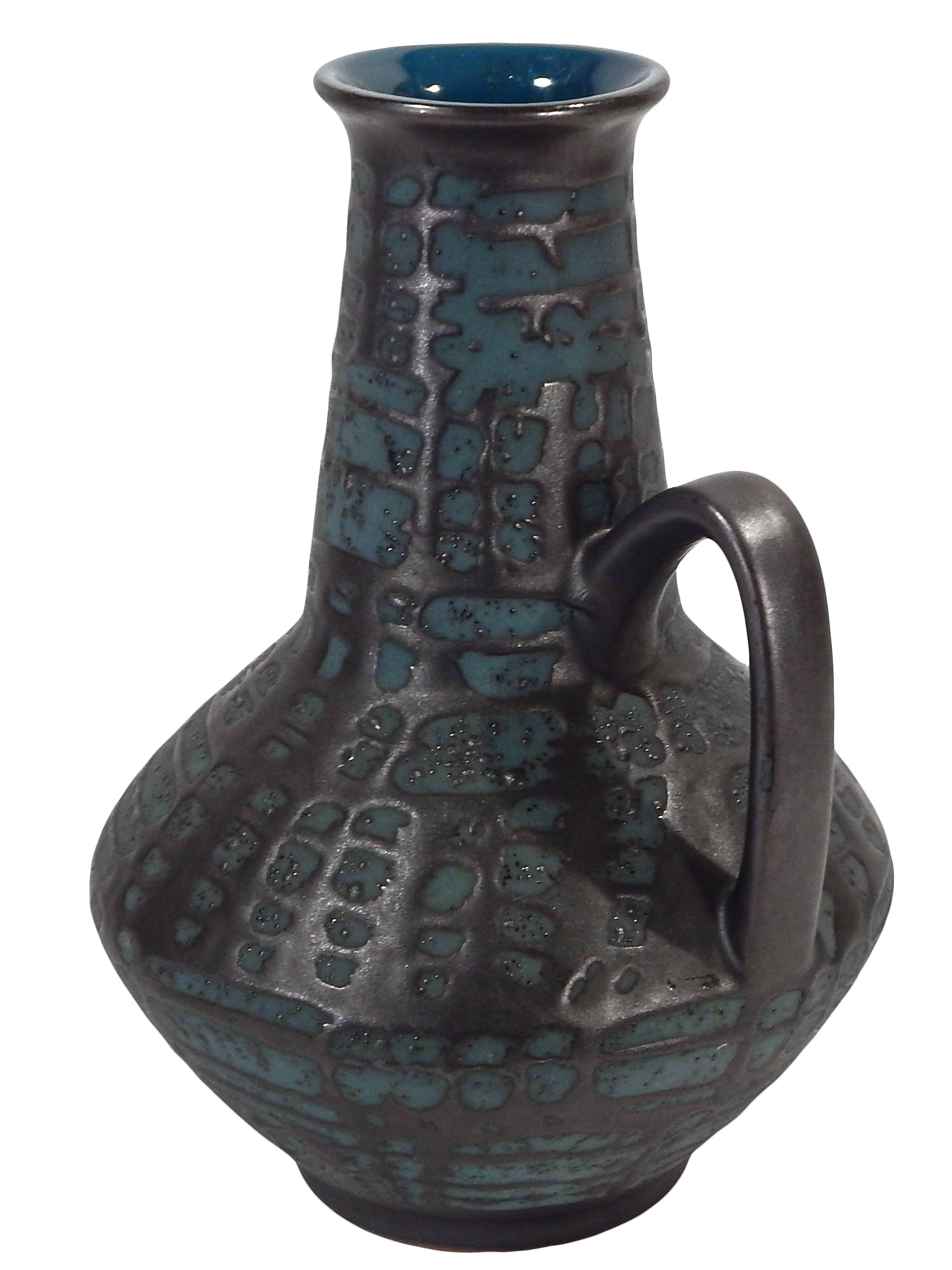 Mid Century Carstens Tonnieshof Handled Vase with Patterened Black Metallic Glazing Over Deep Teal Matt Finish