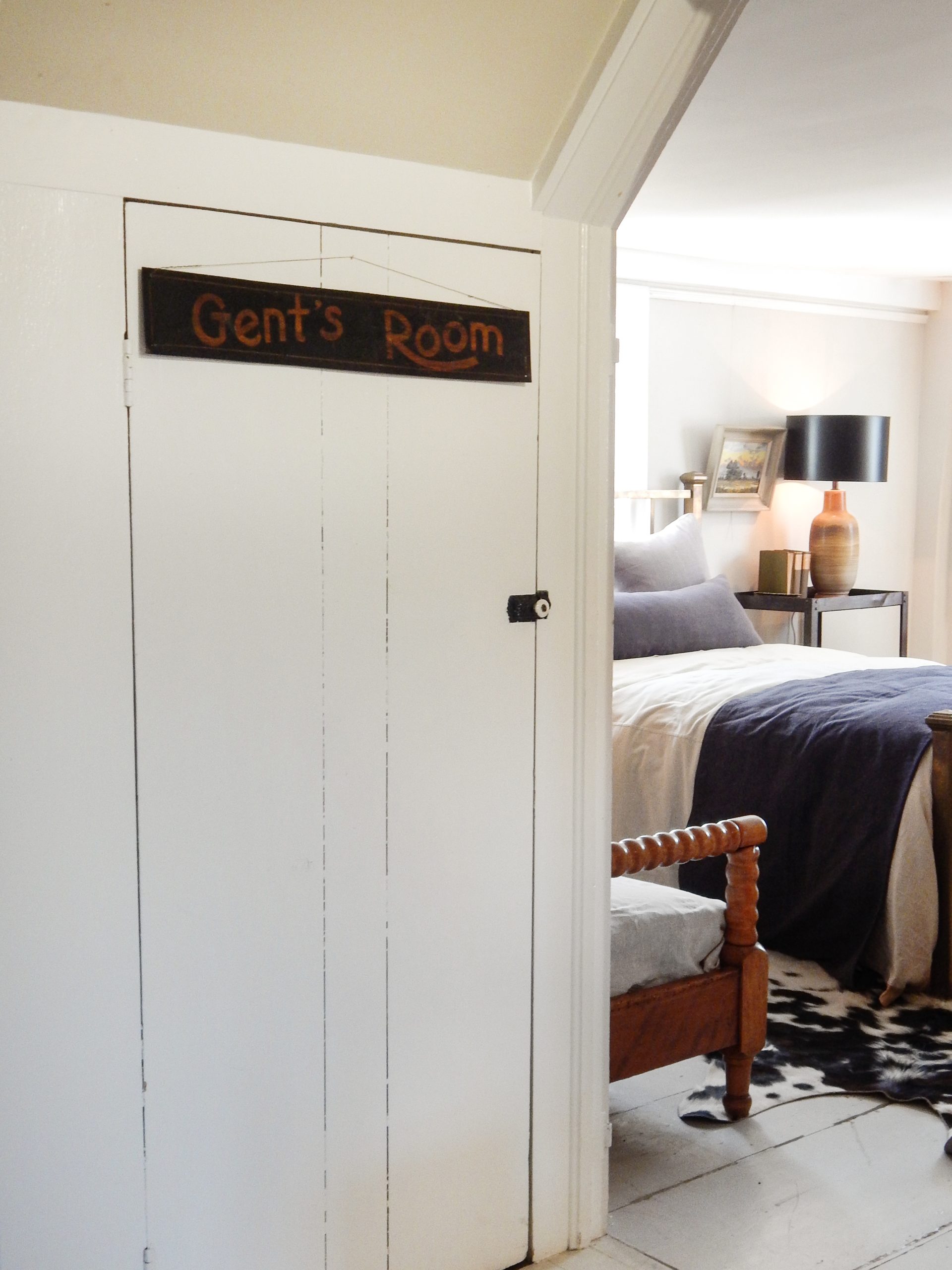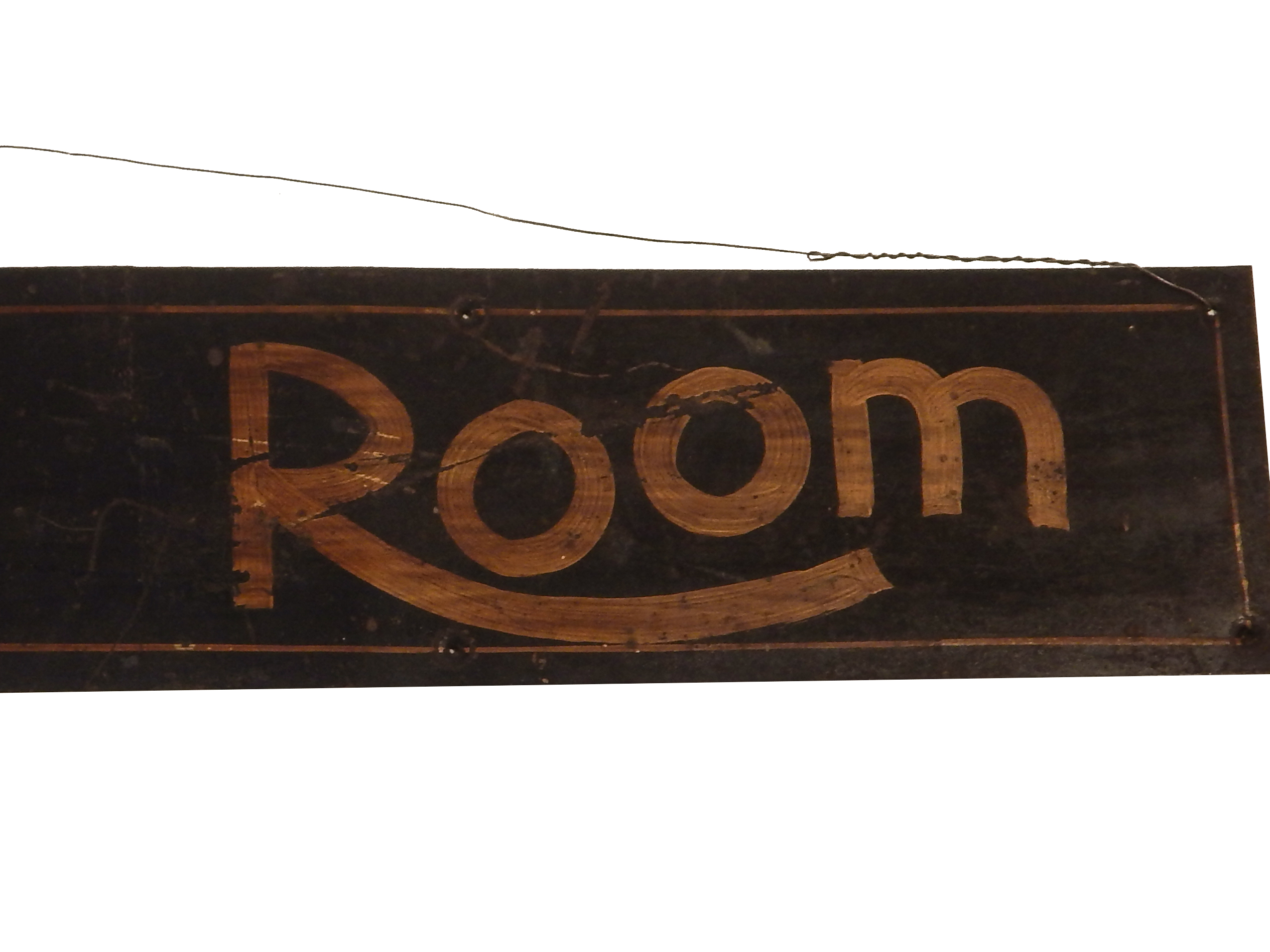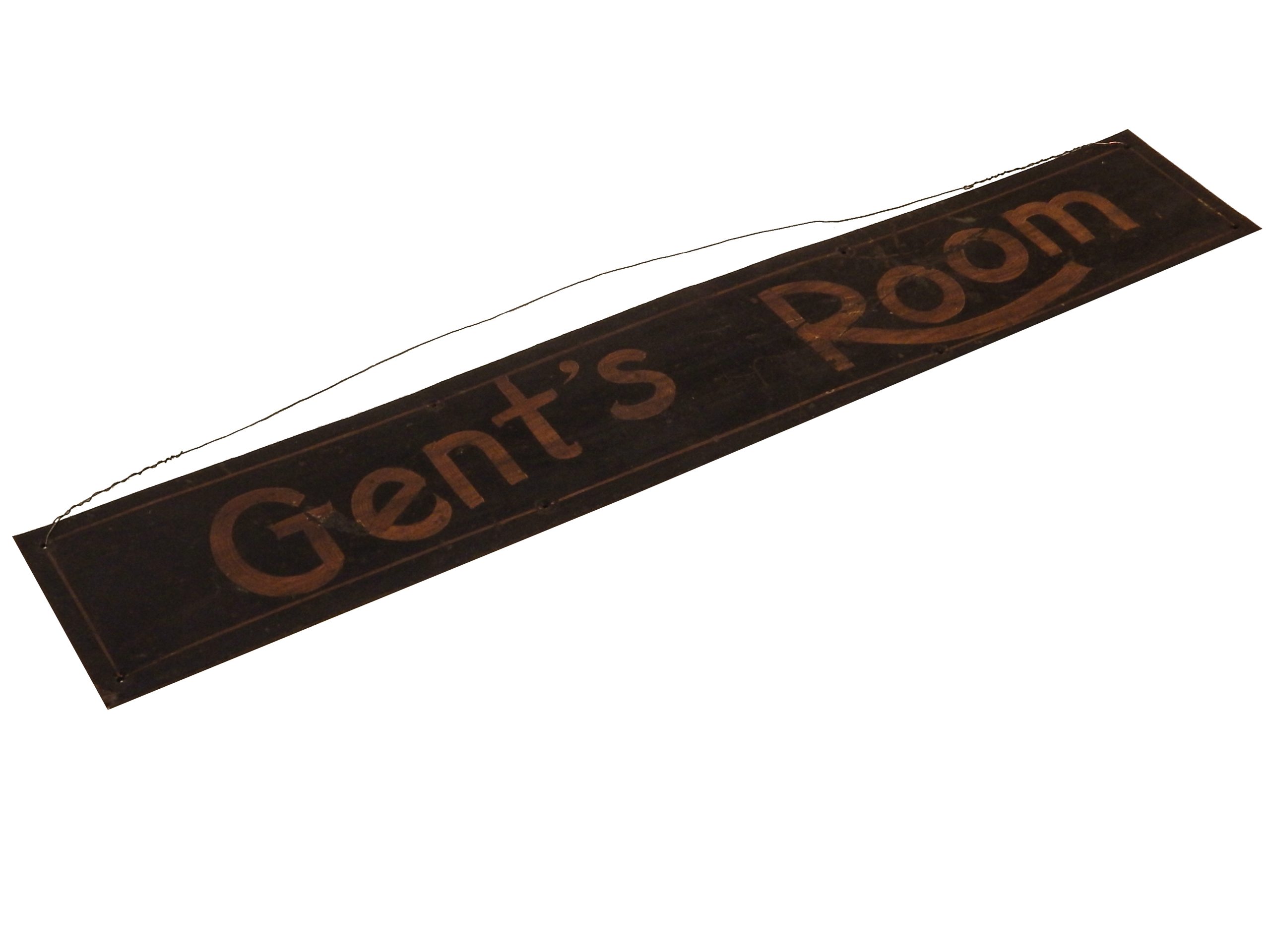 Small, Black Painted Metal Sign Reading ‘Gent’s Room’ in Yellow-Gold