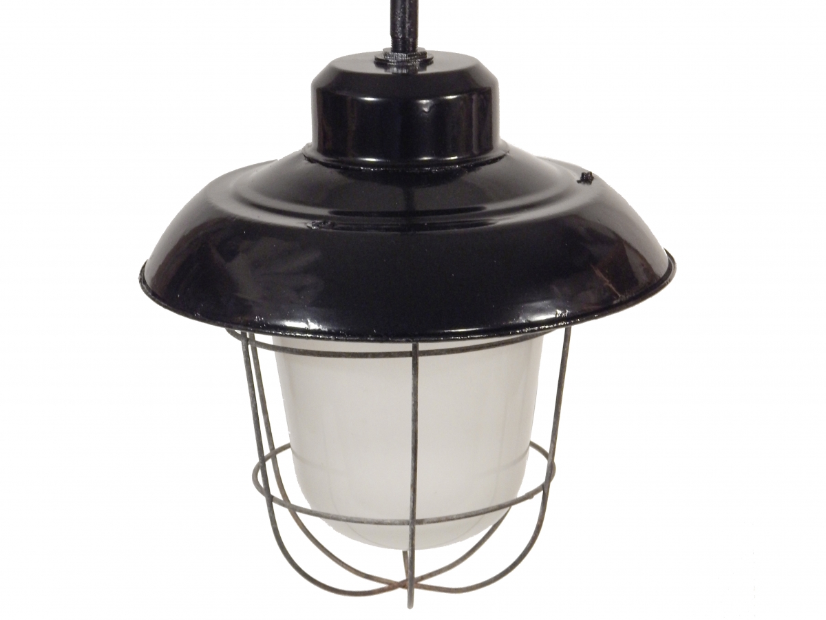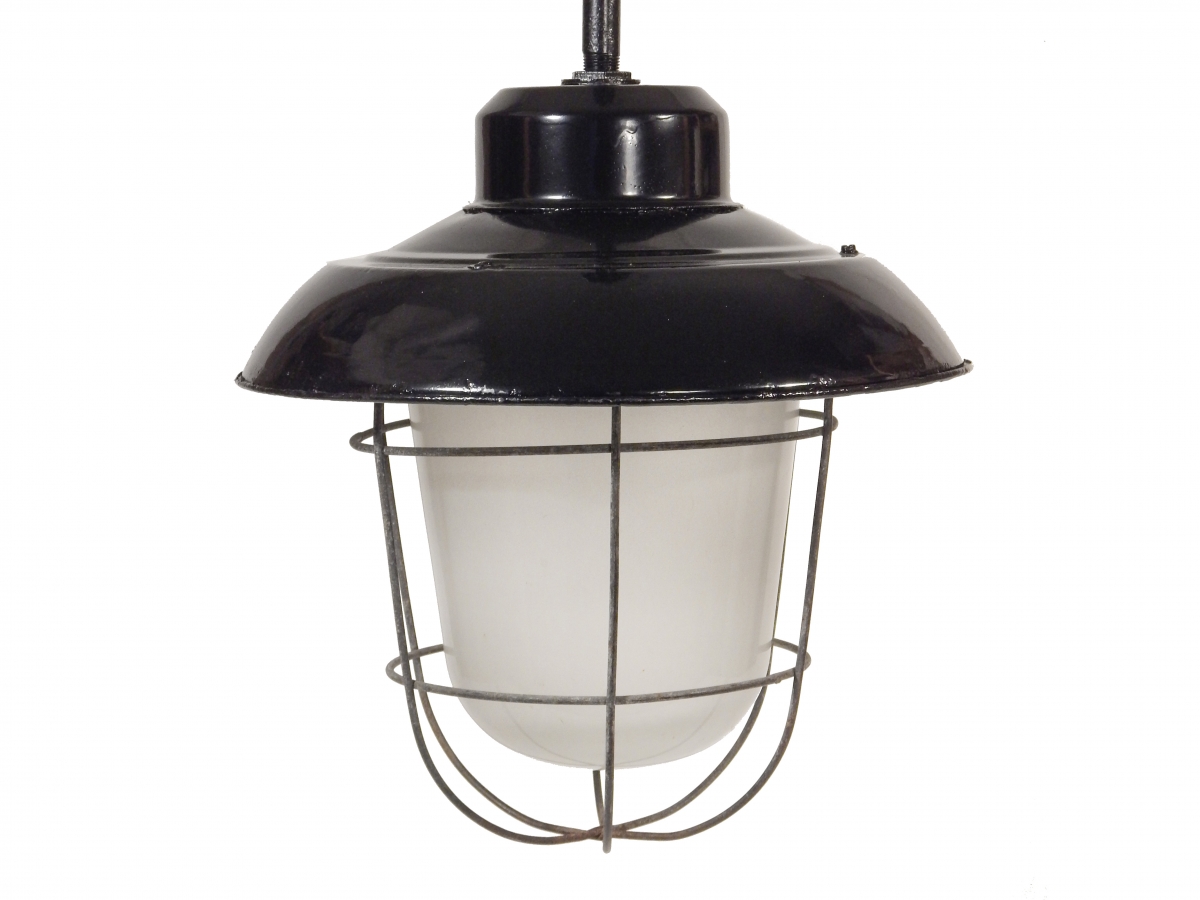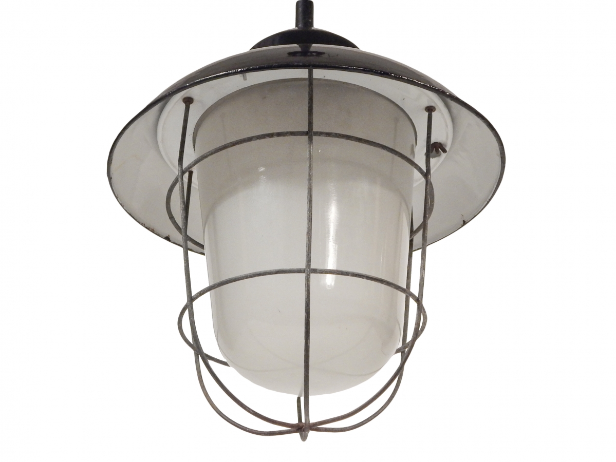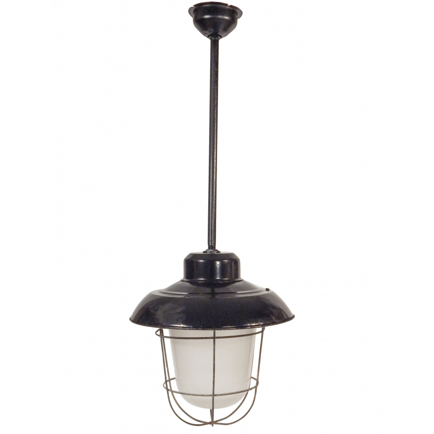 Late 19th Century Industrial Hanging Pole Lamp with Cage & Frosted Glass Globe