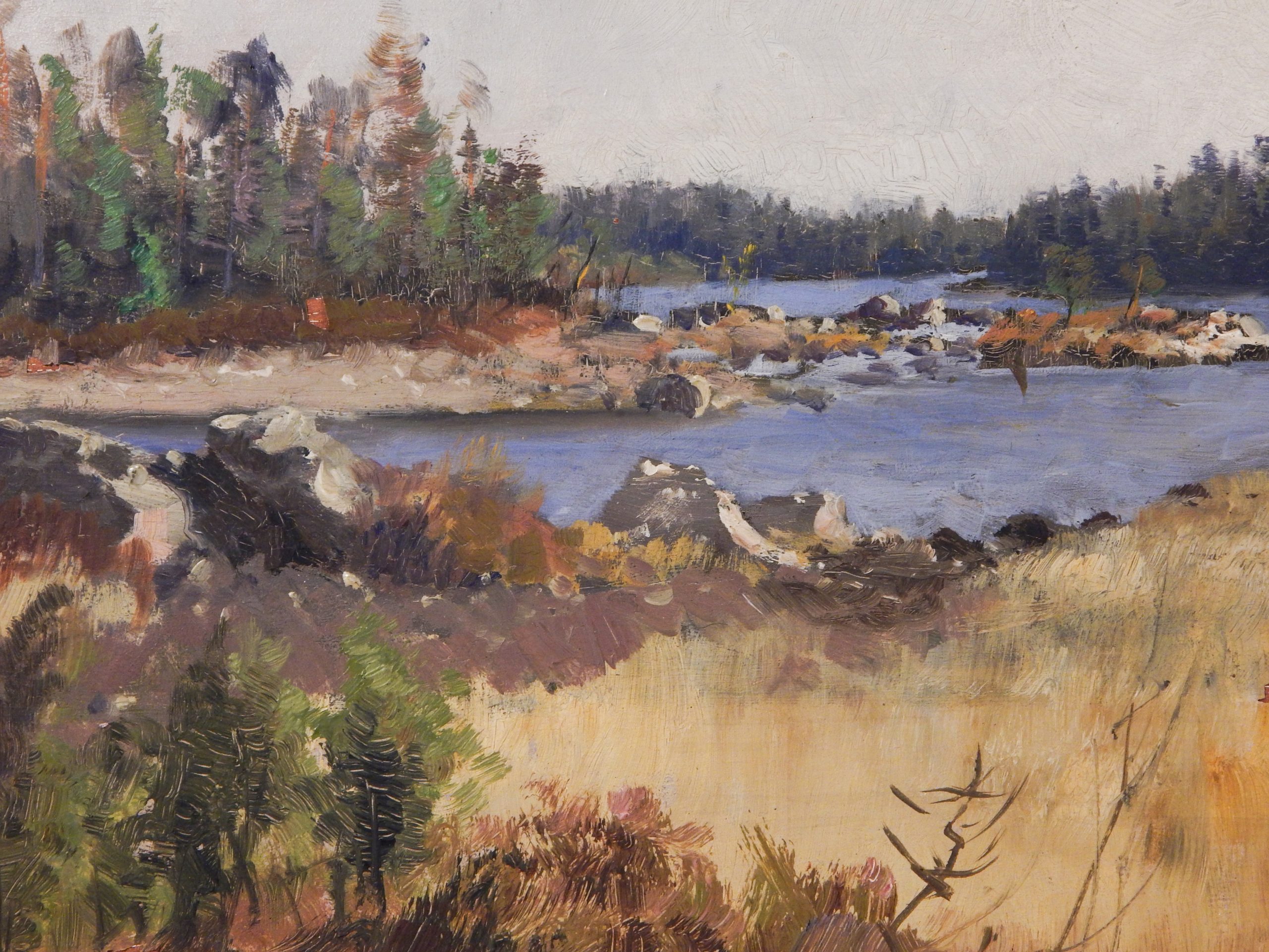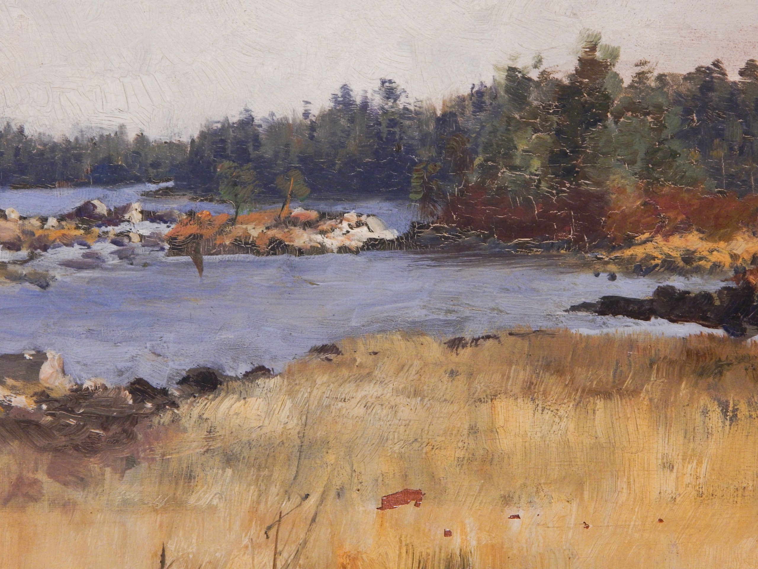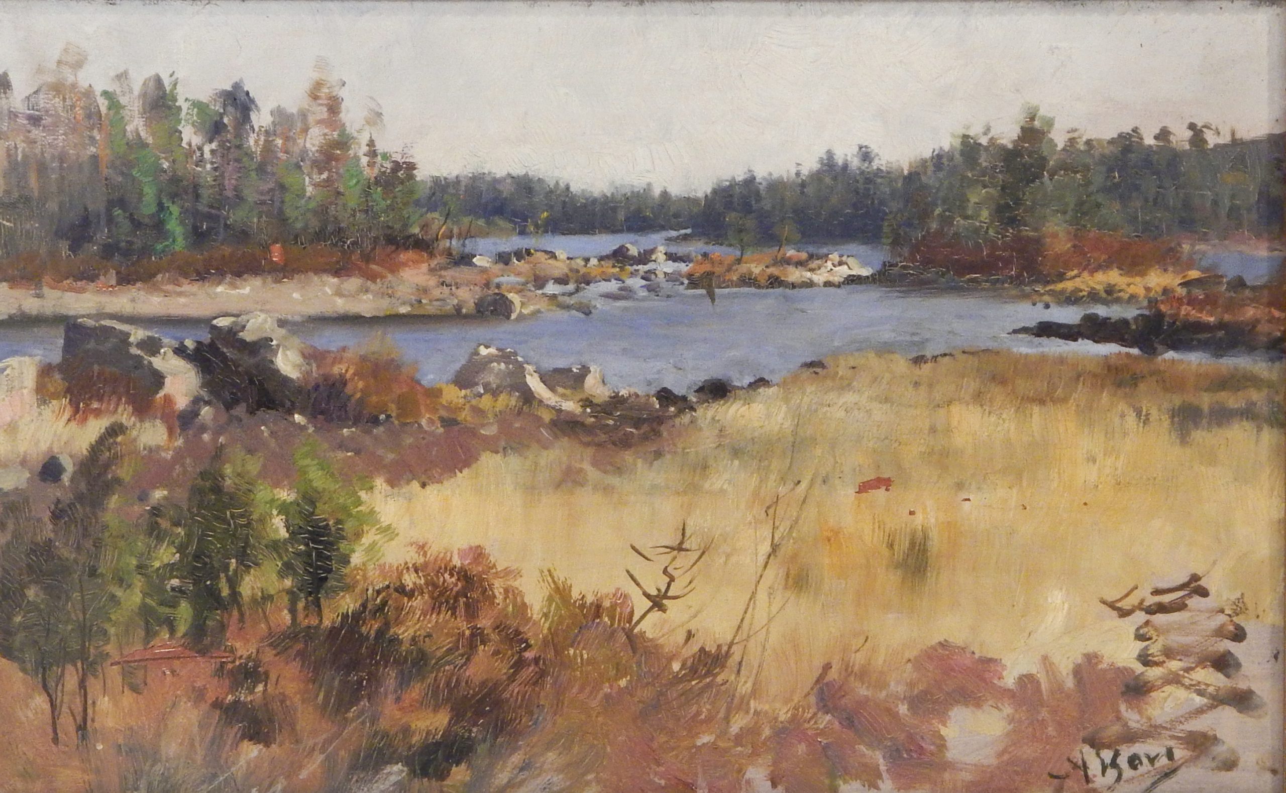 Small Grassy Landscape Painting with Rocky River & Pine Trees by Artist Axel Borg (Sweden, 1847-1916)
