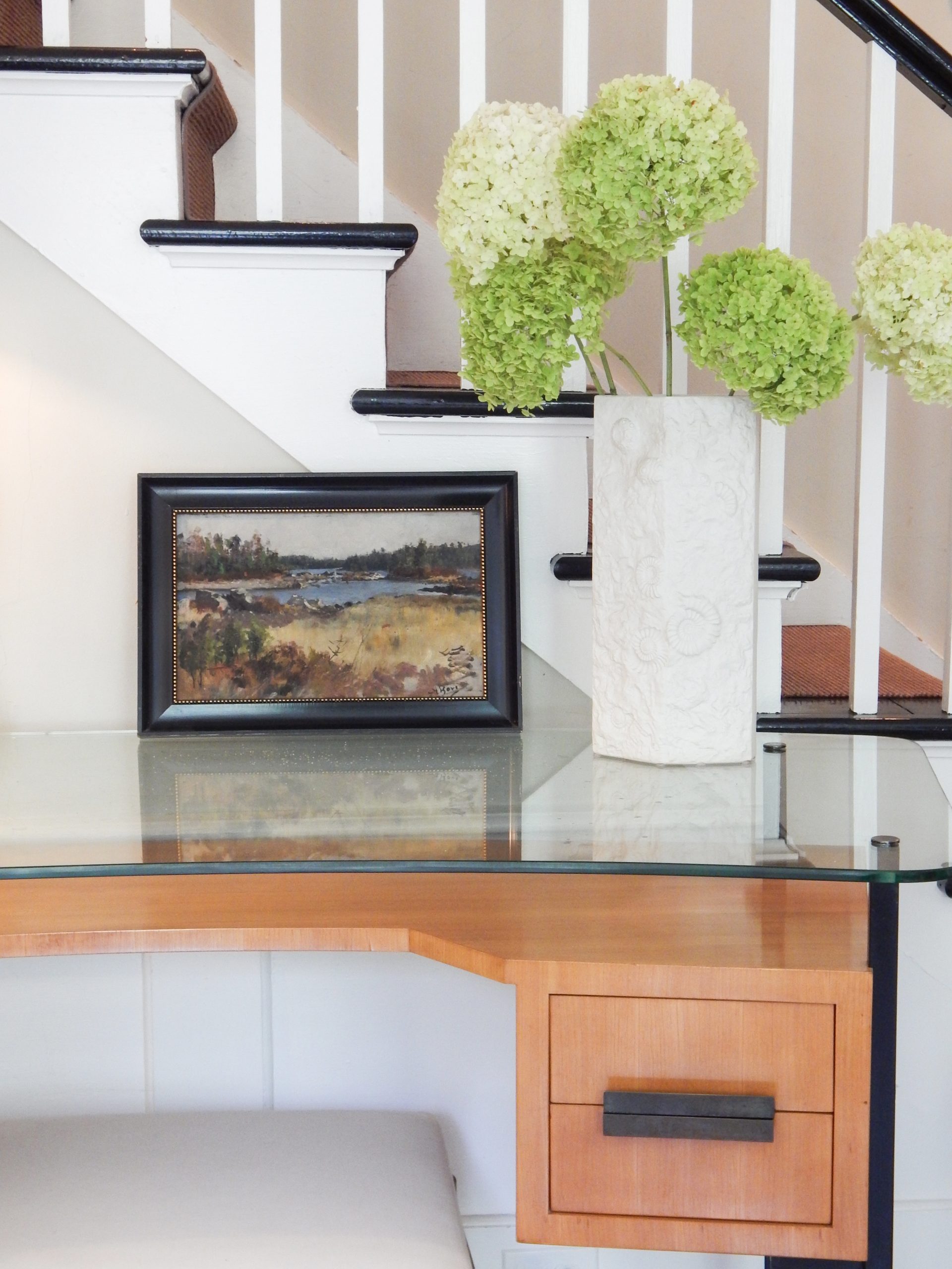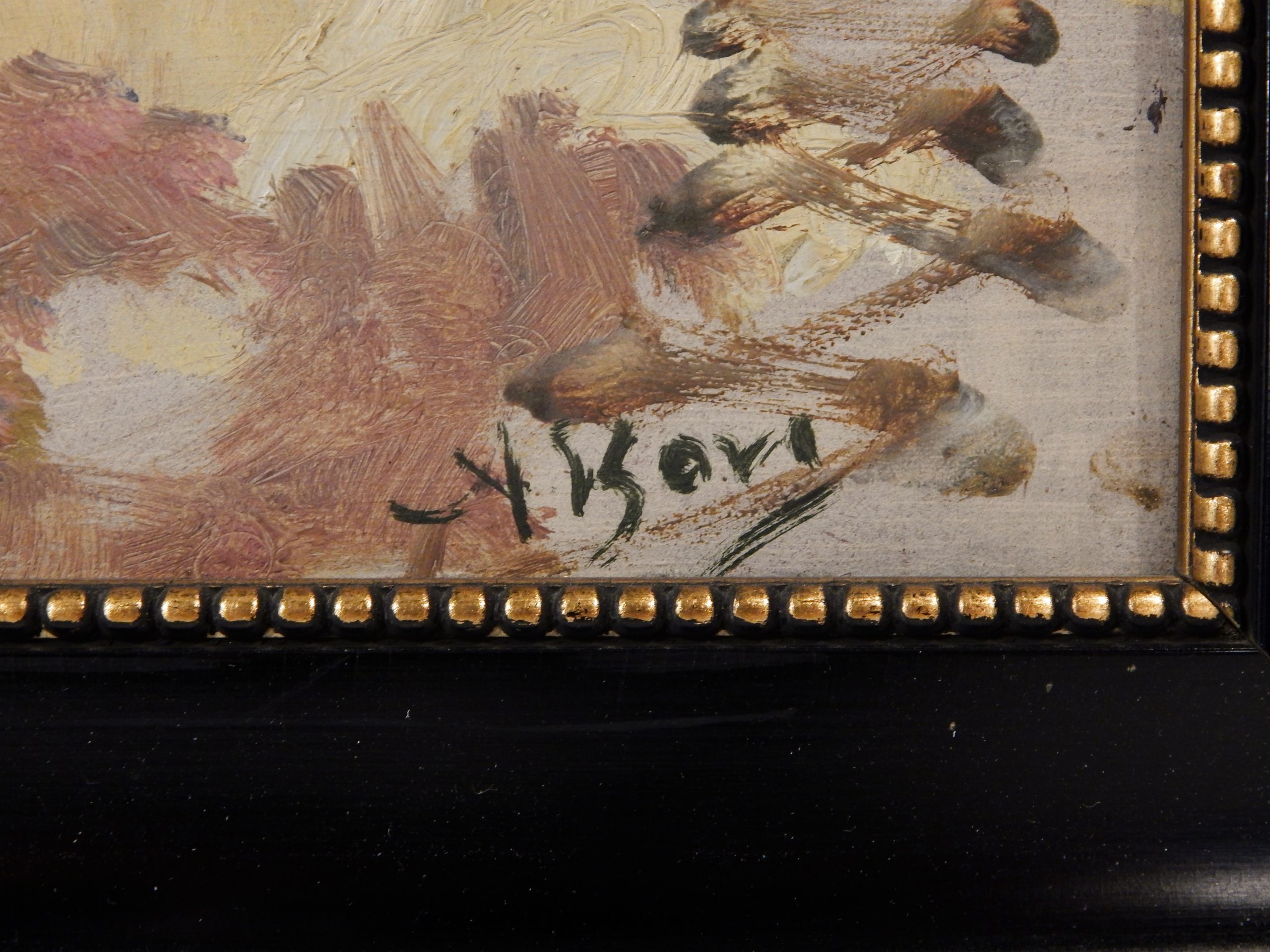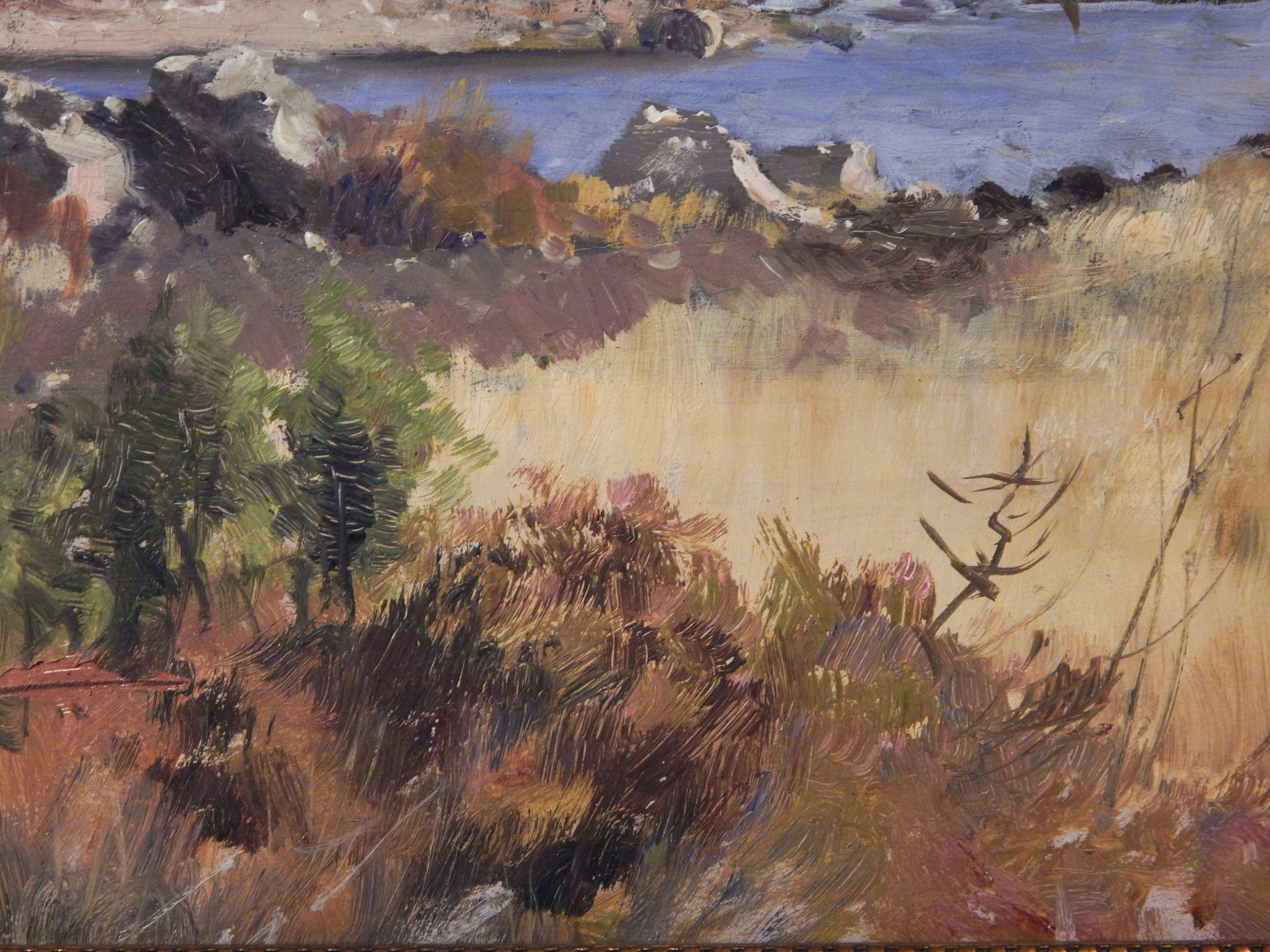 Small Grassy Landscape Painting with Rocky River & Pine Trees by Artist Axel Borg (Sweden, 1847-1916)