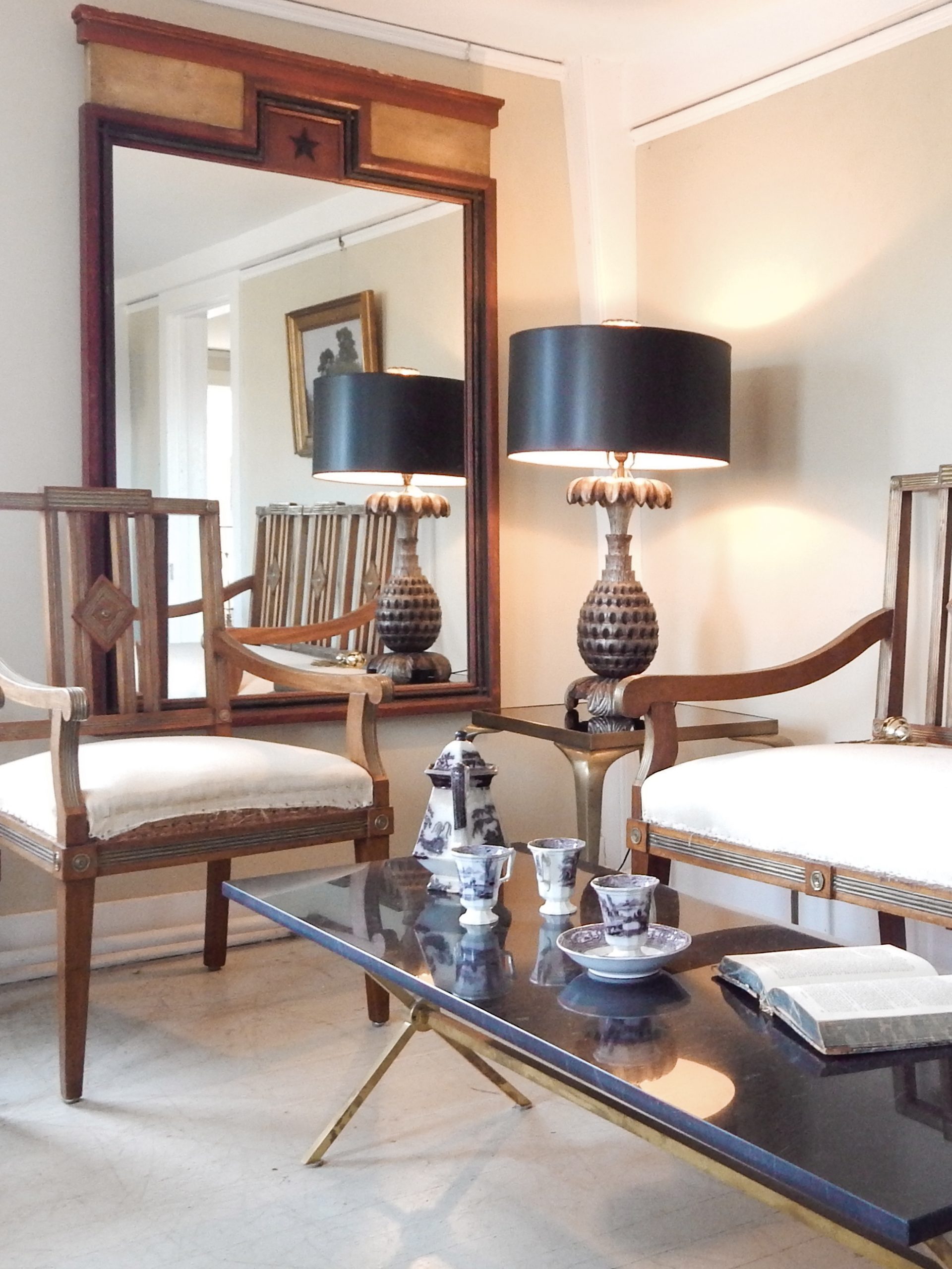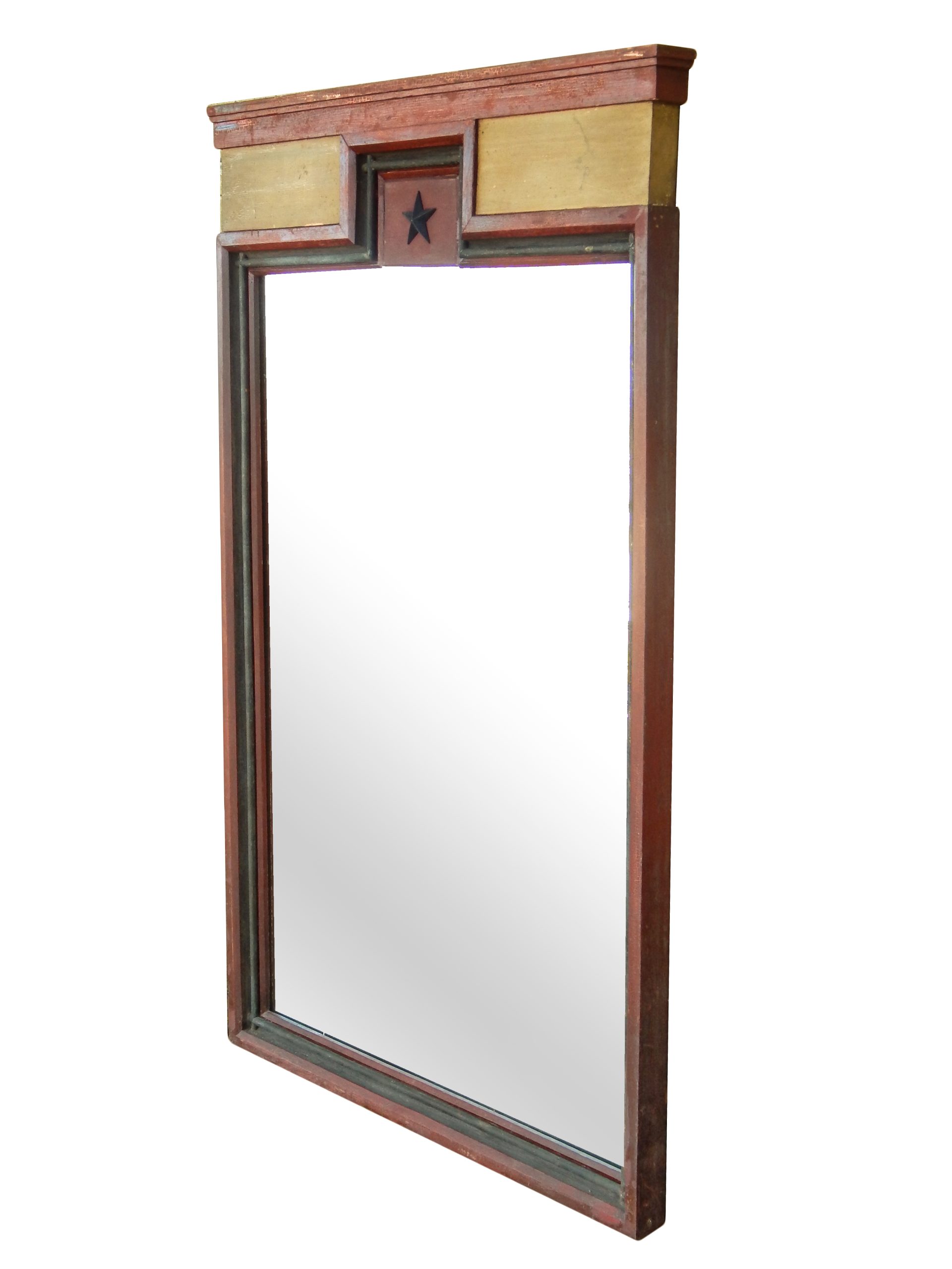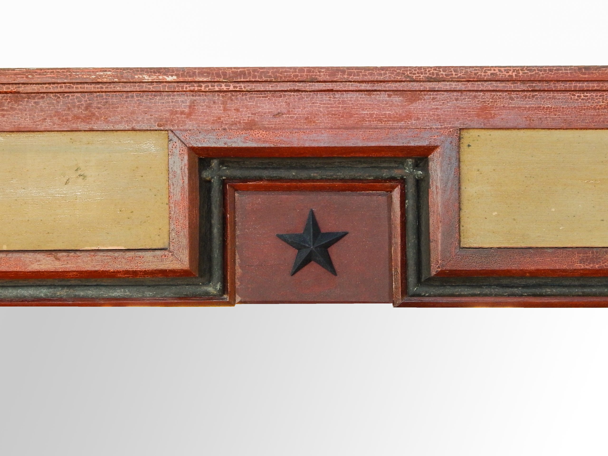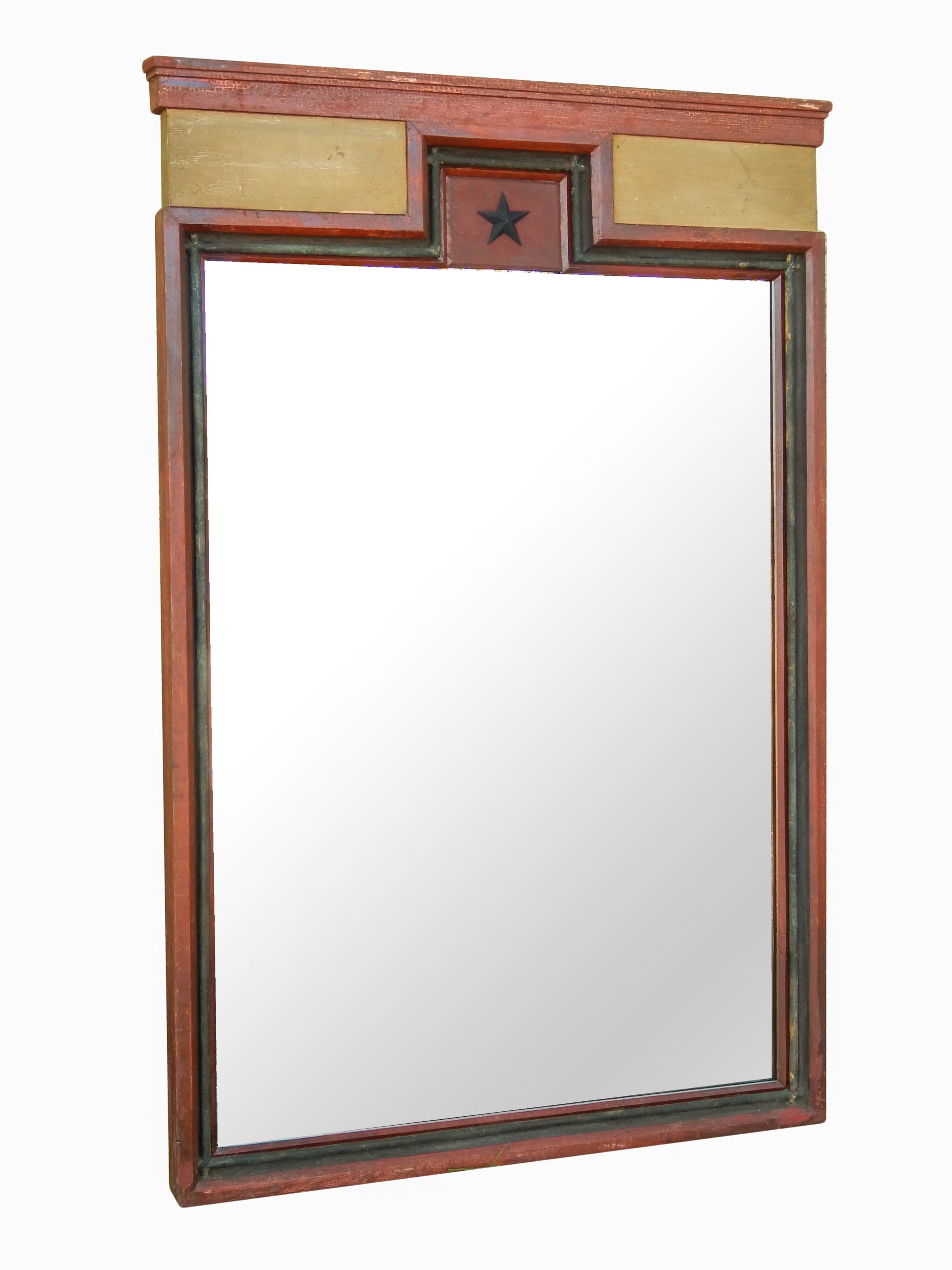 Large Early 20th Century, Rustic Mirror in Architectural Frame Painted Red, Yellow & Black with New Glass