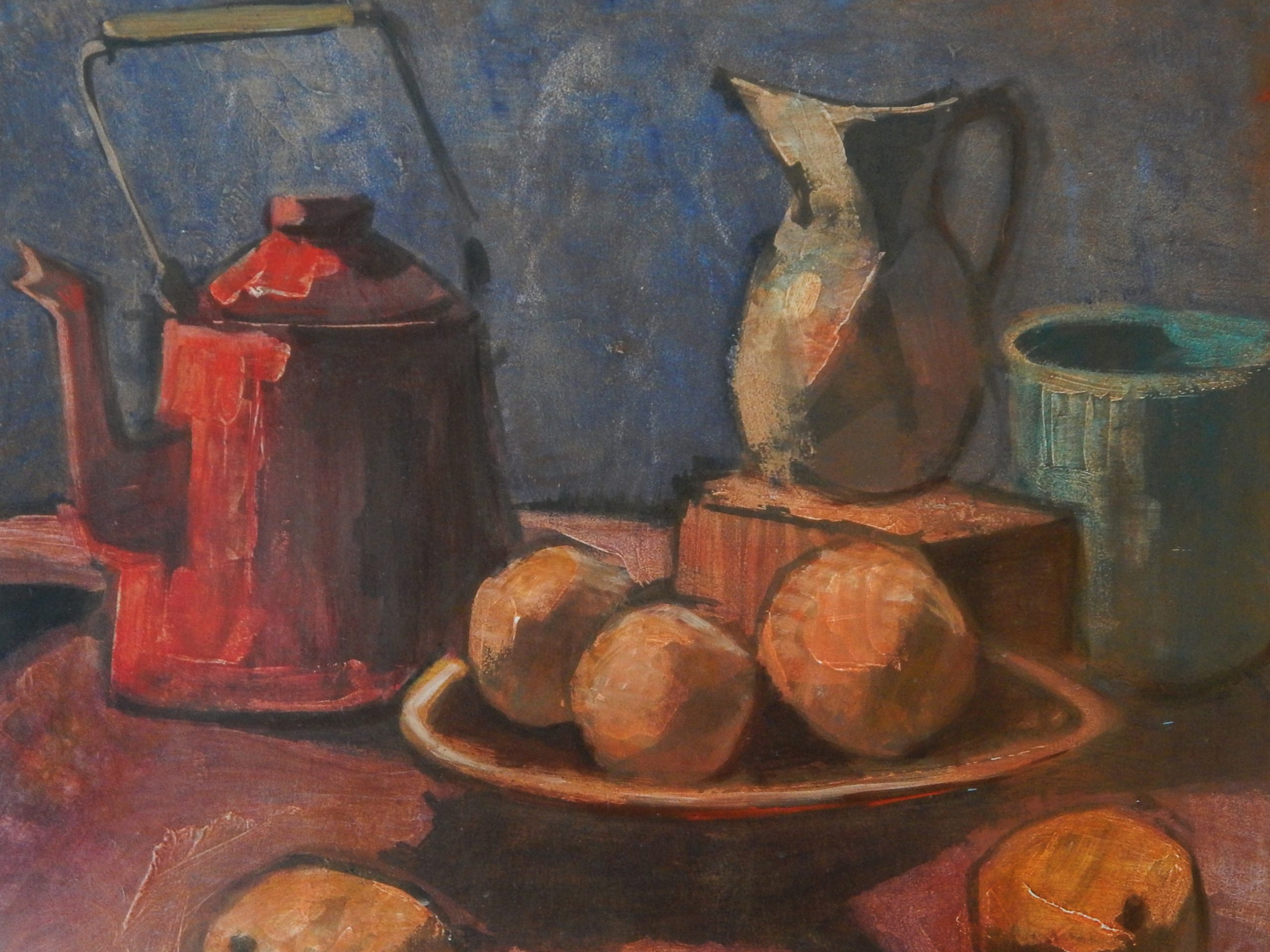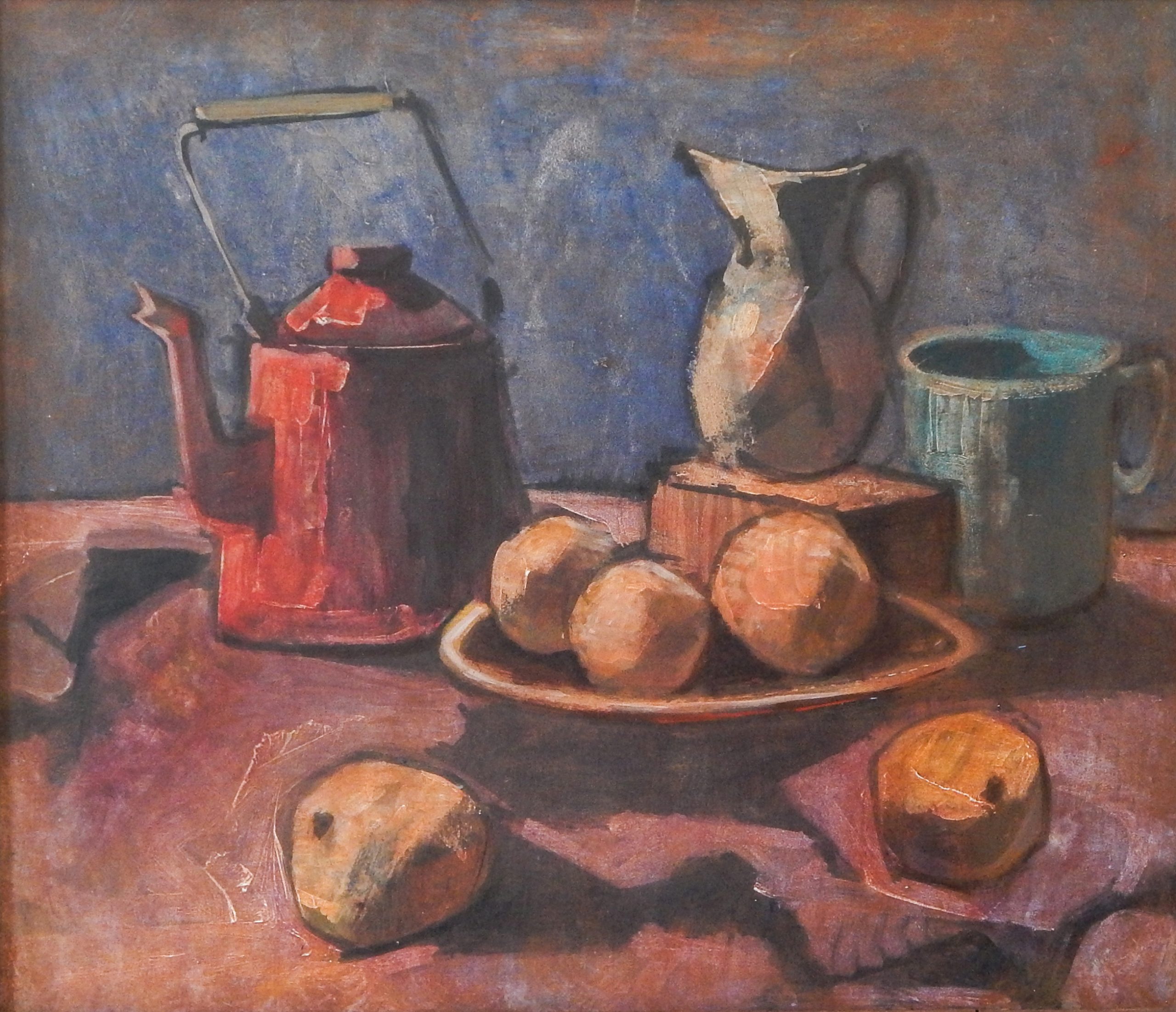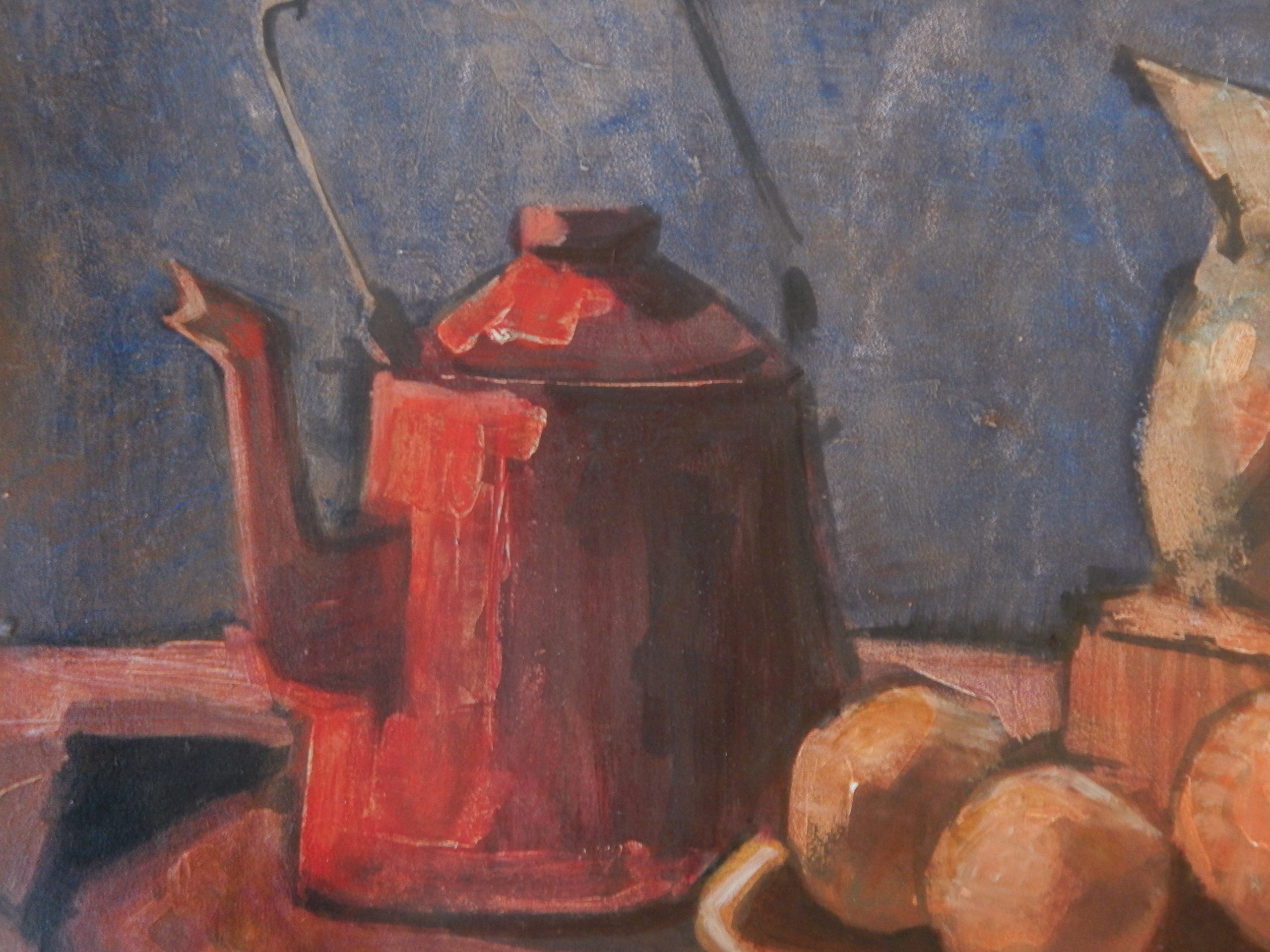 20th Century Modernist Still Life, Featuring a Tea Kettle, Mug & Fruit by Bill Bristow