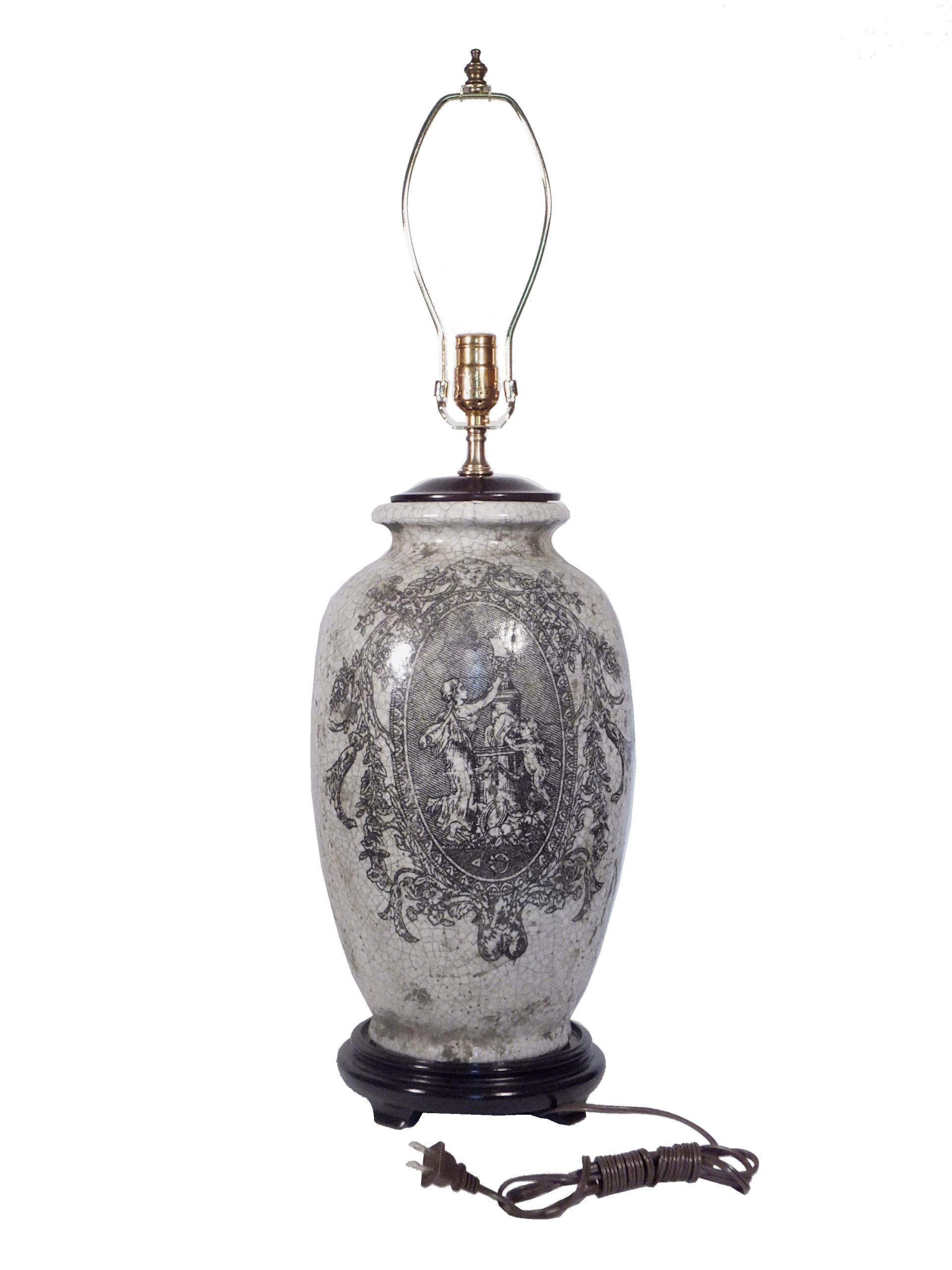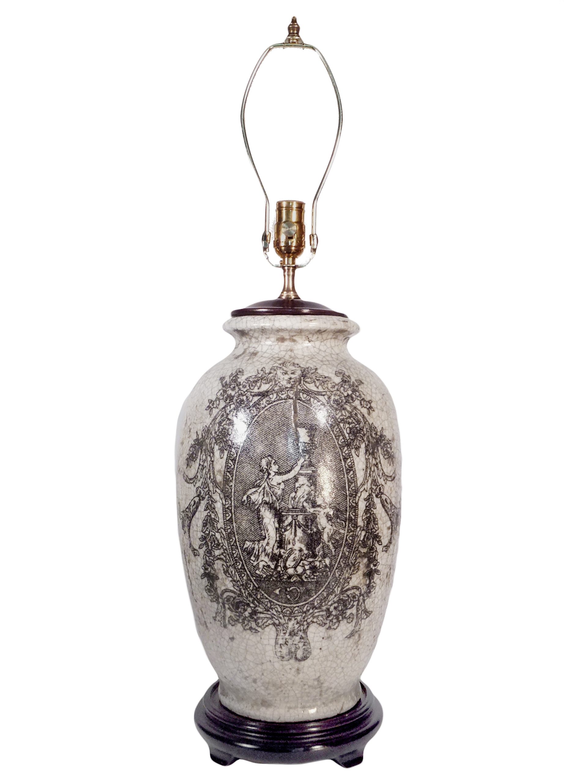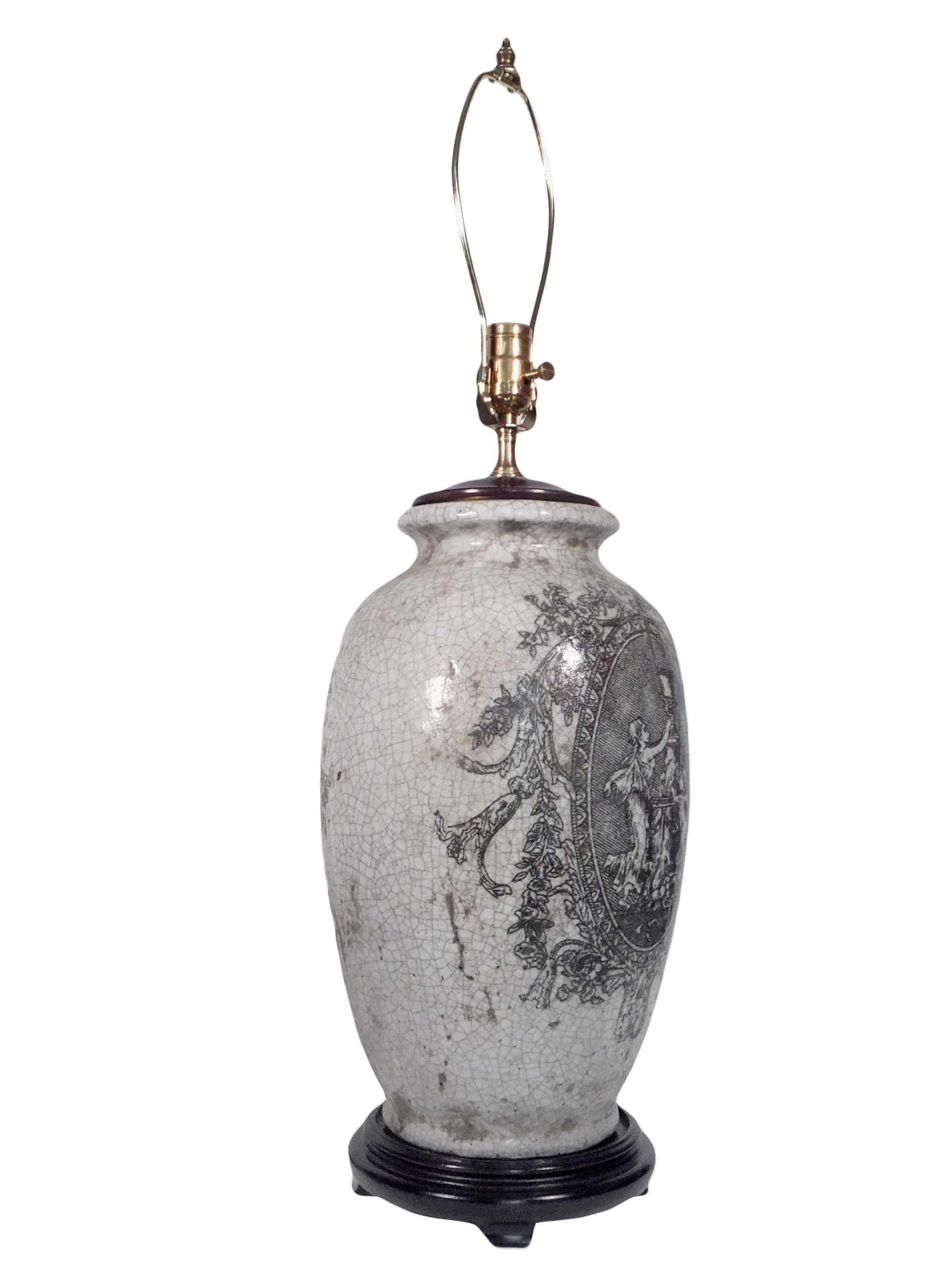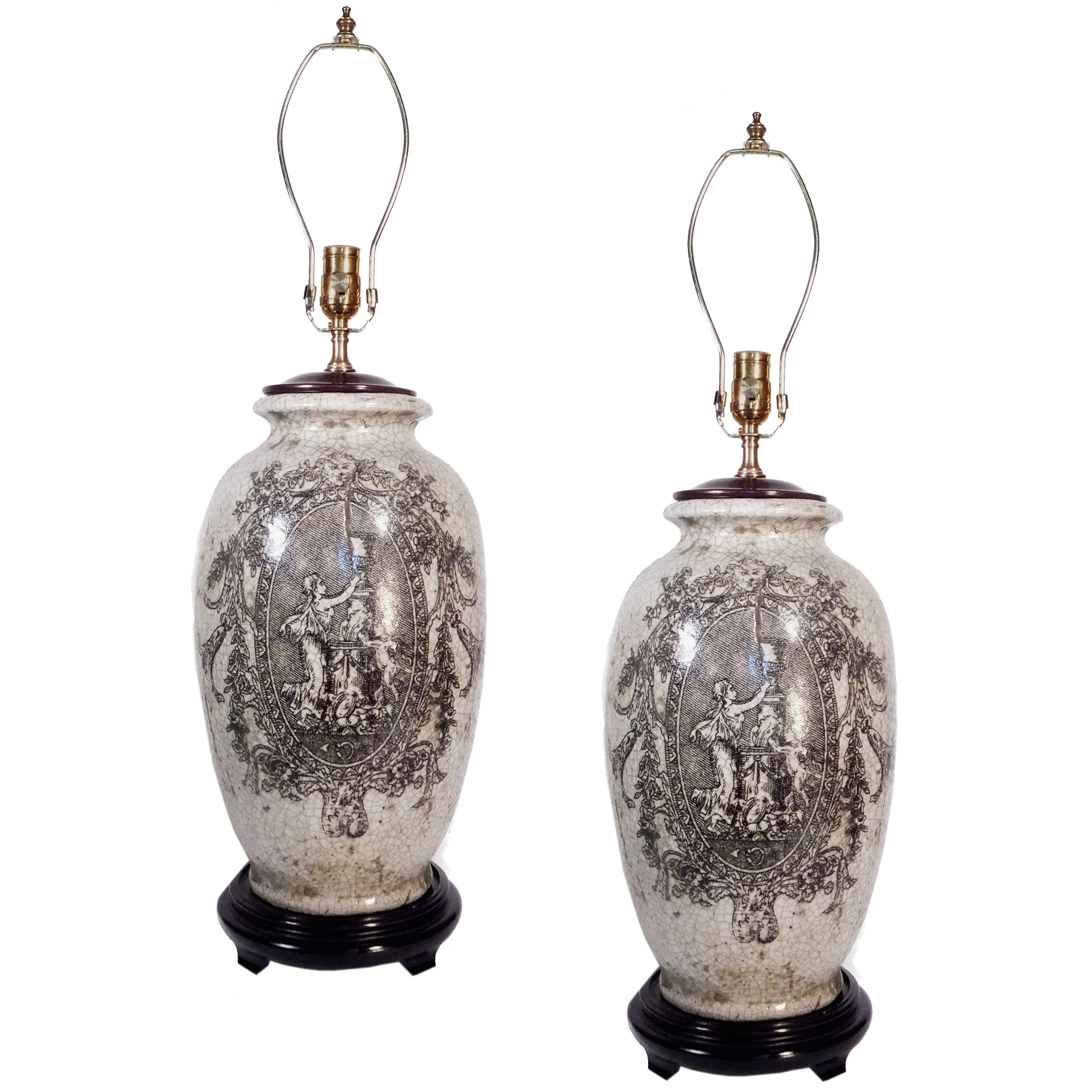 Pair of Crackled Pale Grey Ceramic Urn Lamps with Black Line Transfer & Wood Base