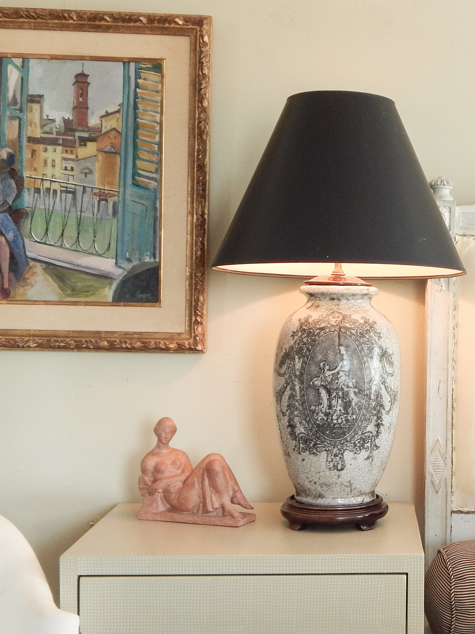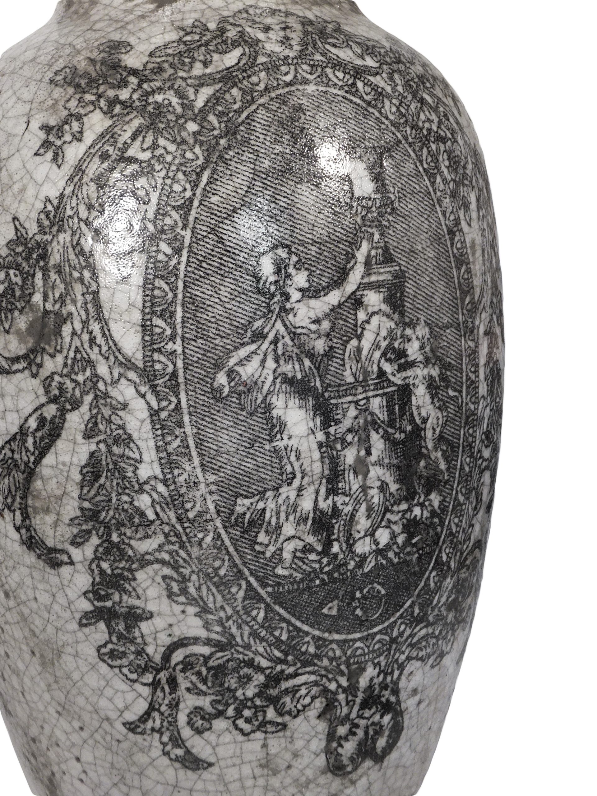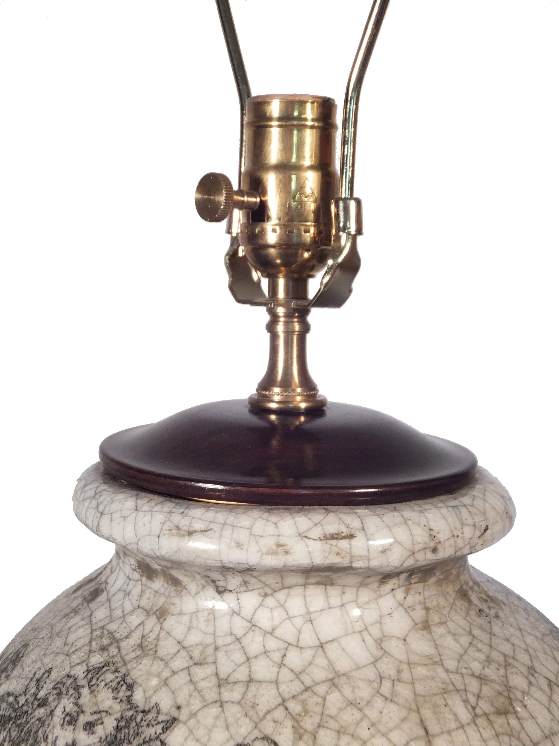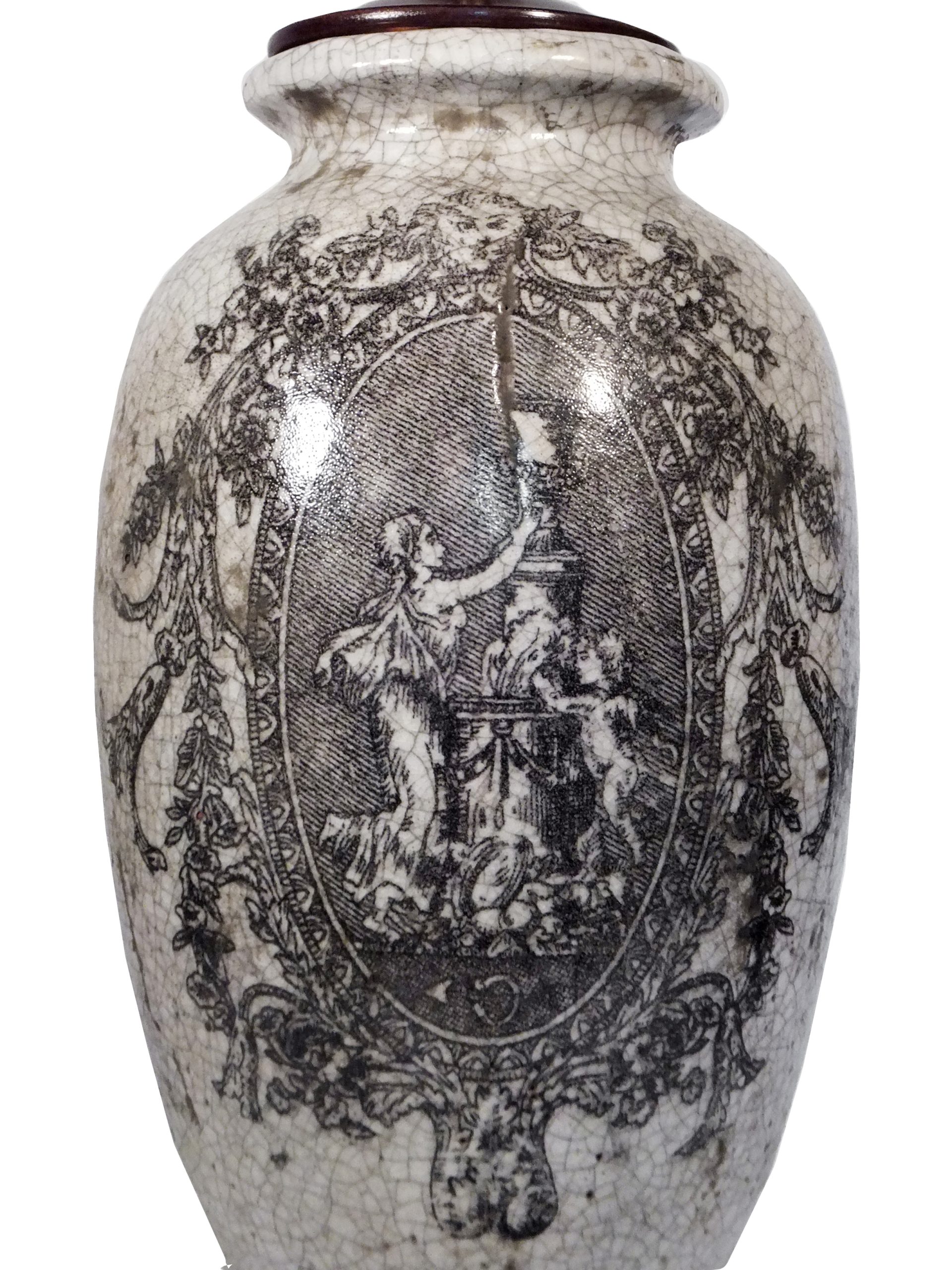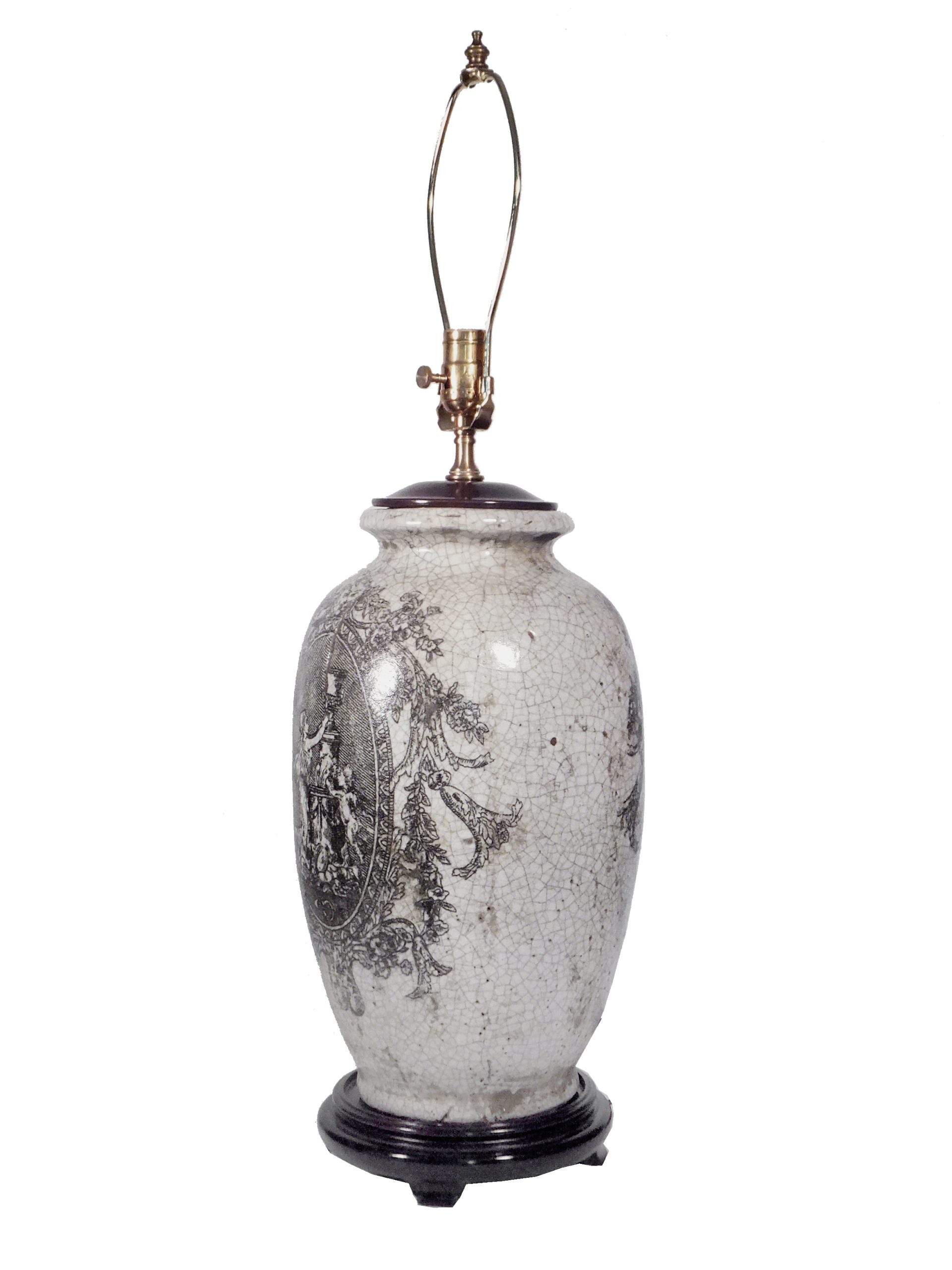Pair of Crackled Pale Grey Ceramic Urn Lamps with Black Line Transfer & Wood Base