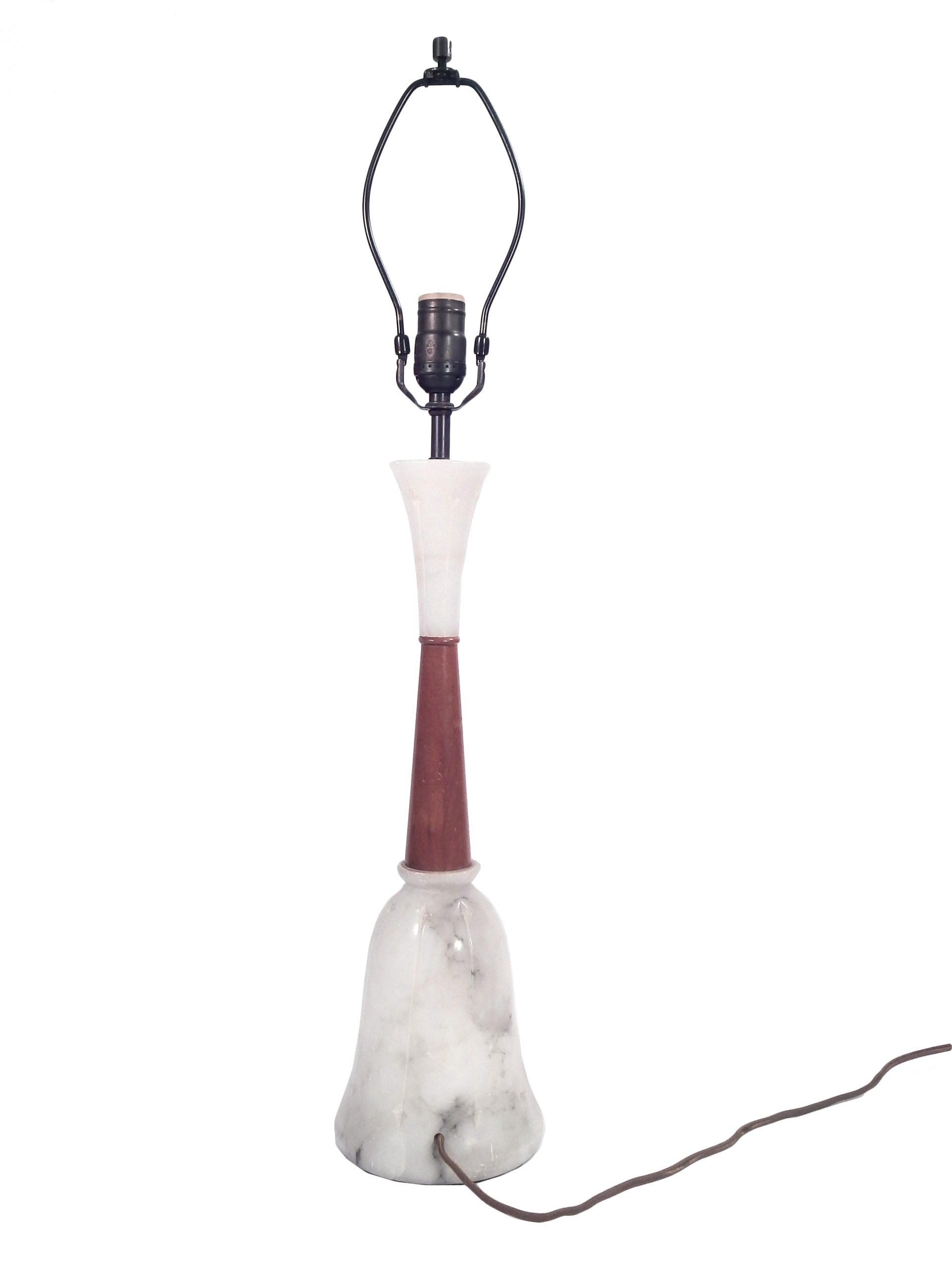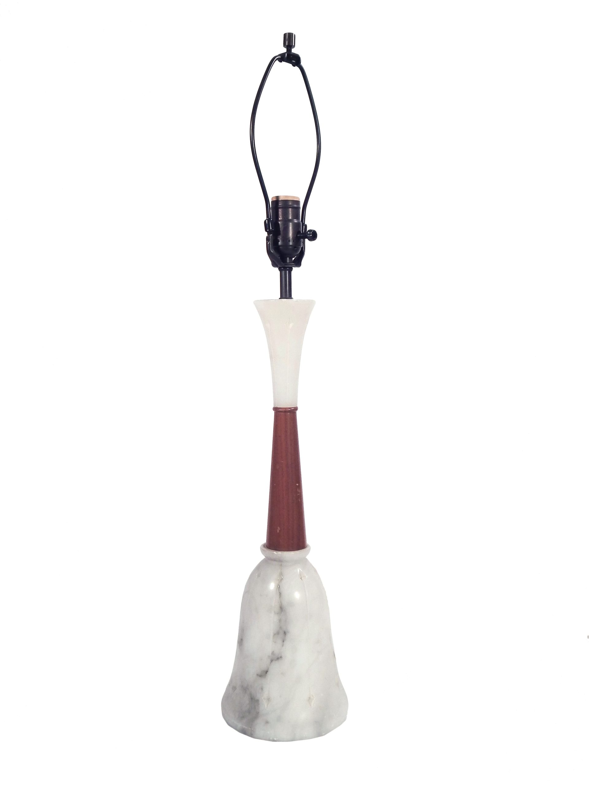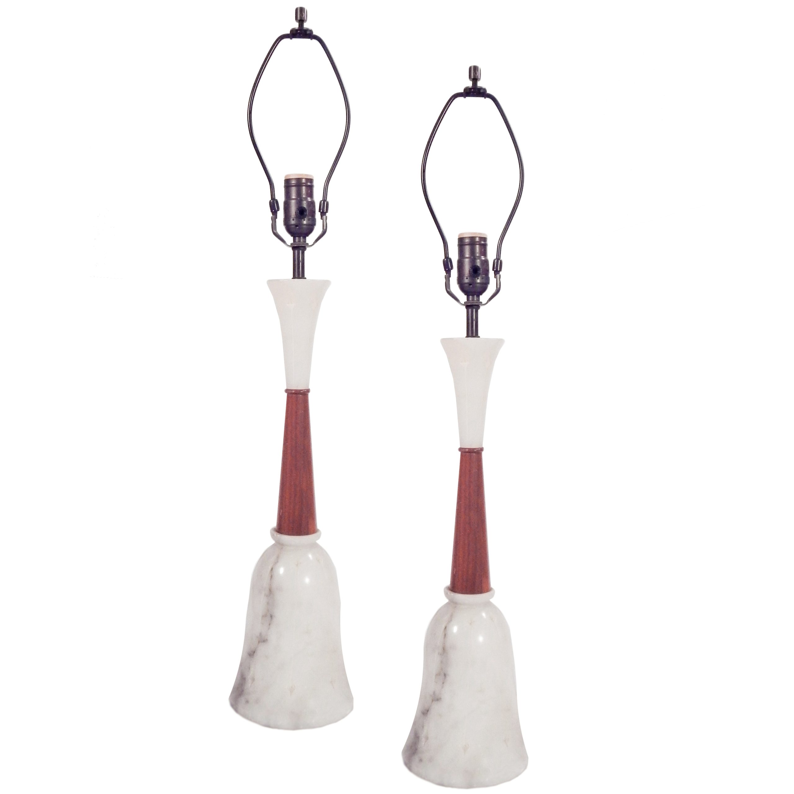 Matching Pair of Mid-Century Marble and Teak Table Lamps