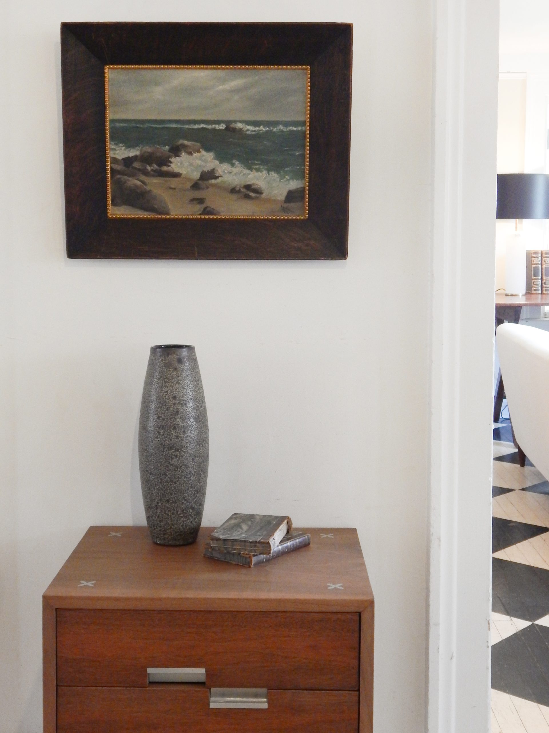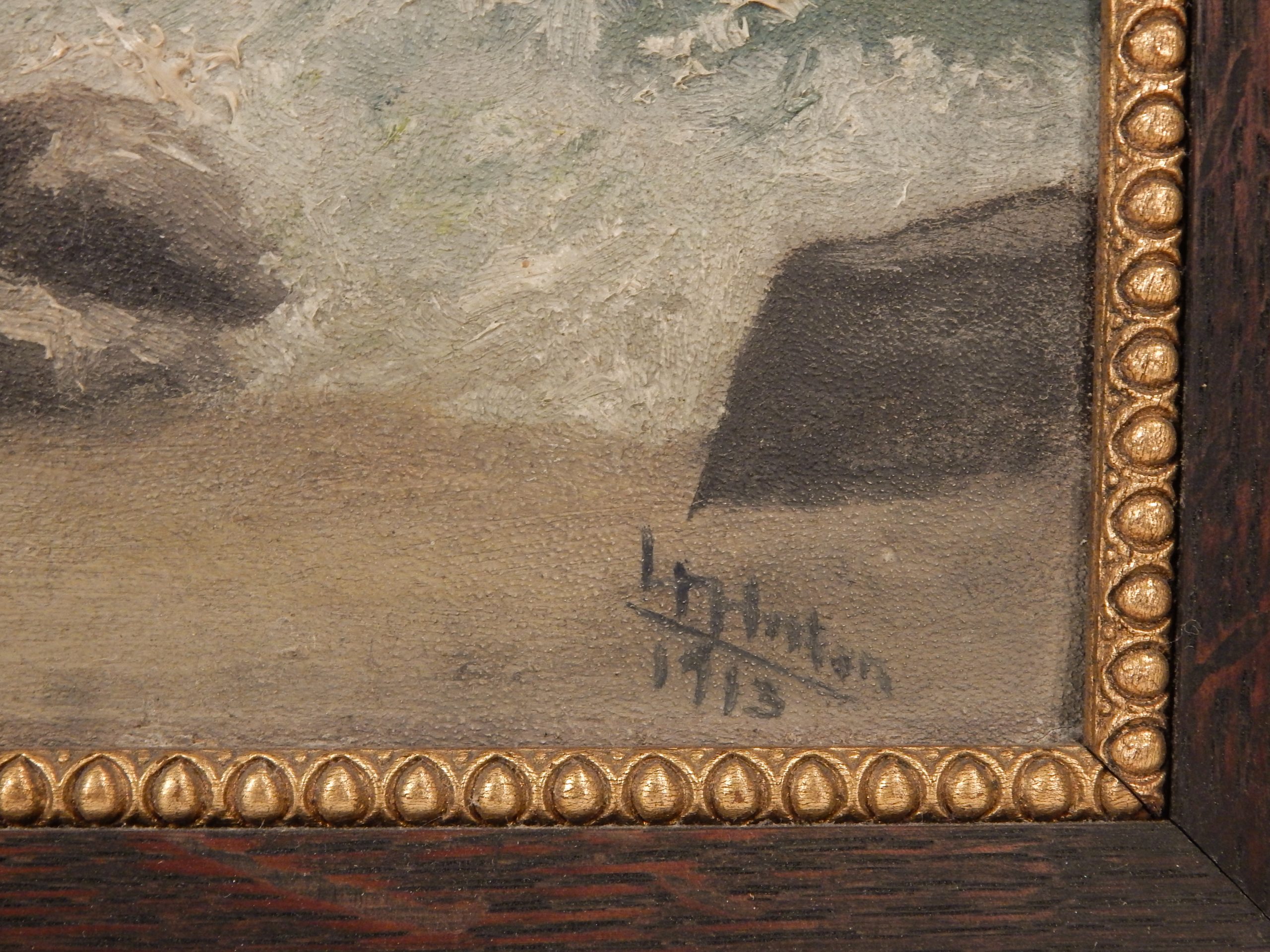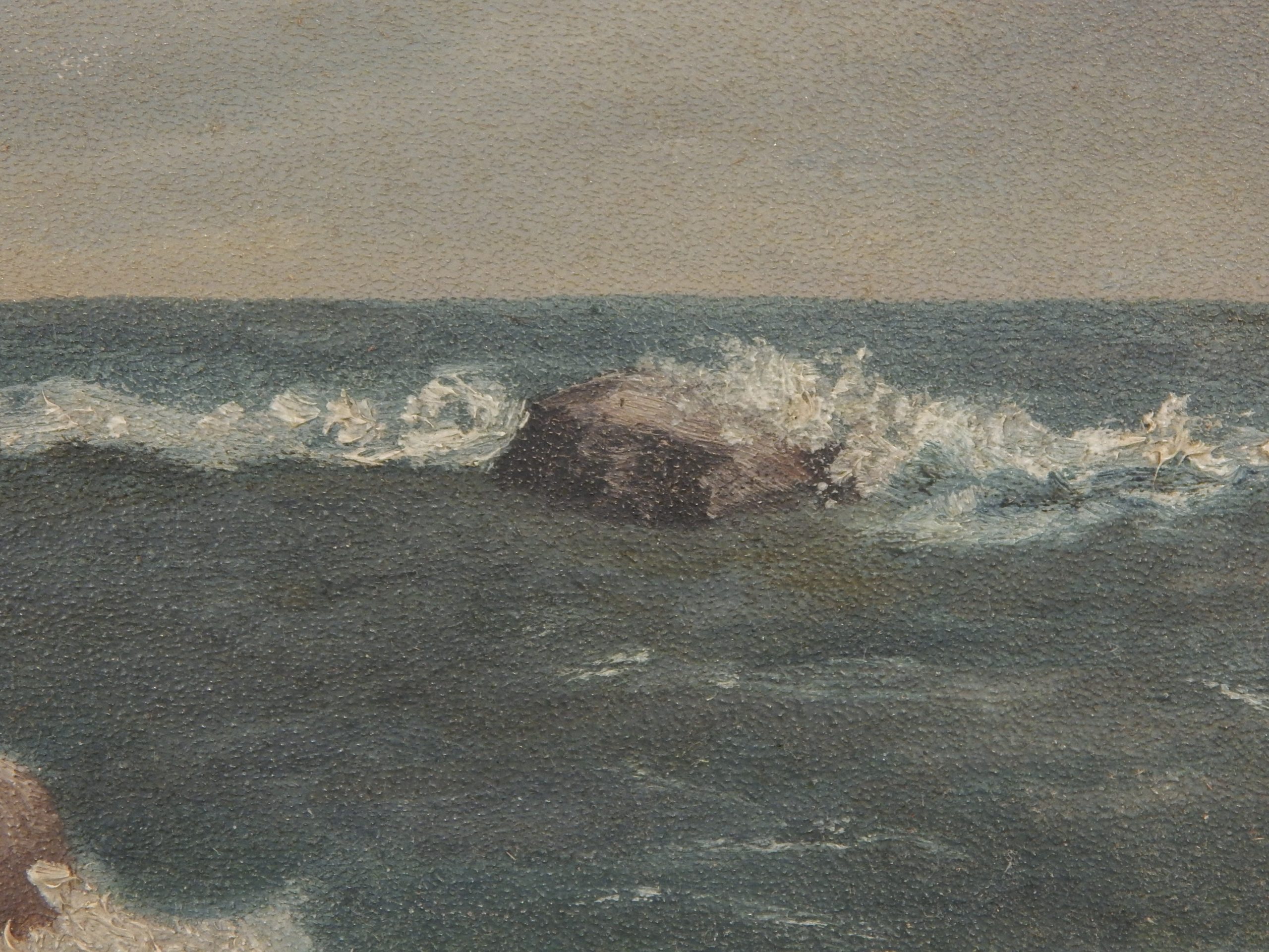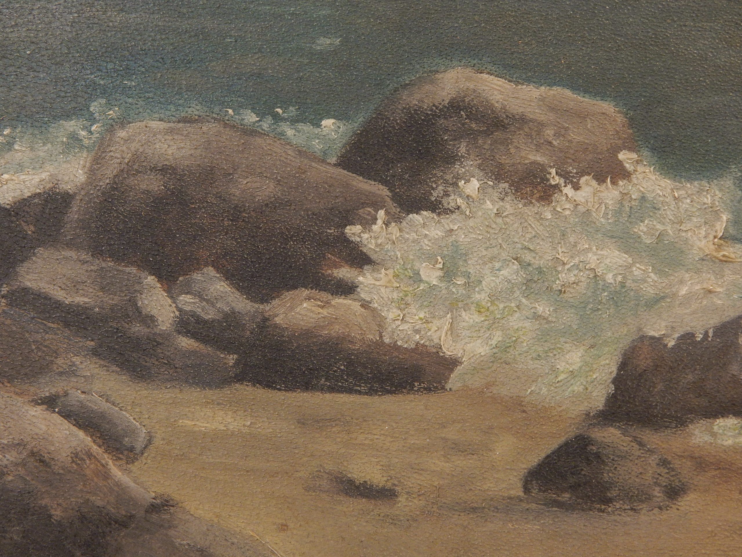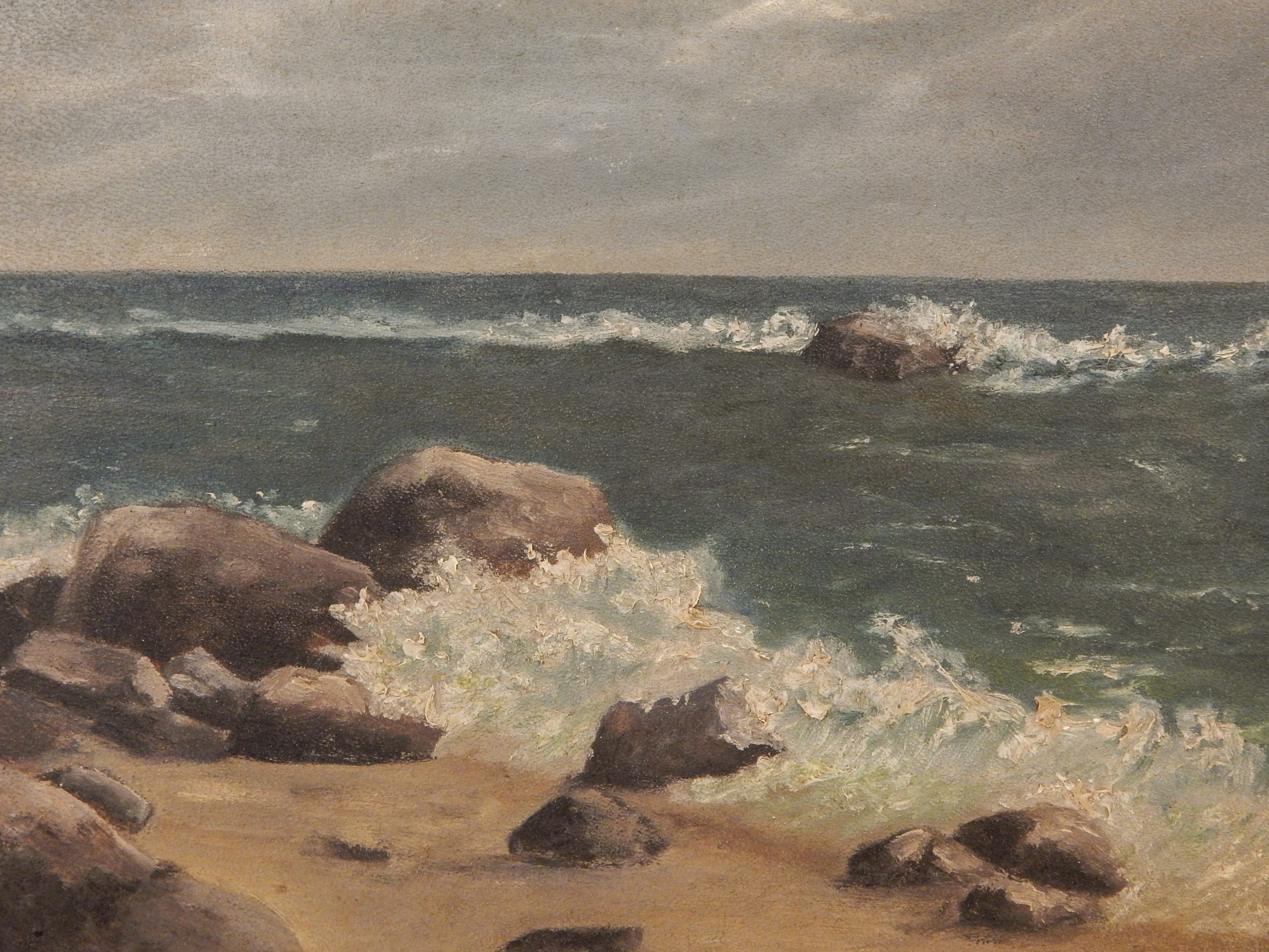Early 20th Century Seascape, Featuring Waves Breaking on a Rocky Shoreline with Overcast Skys