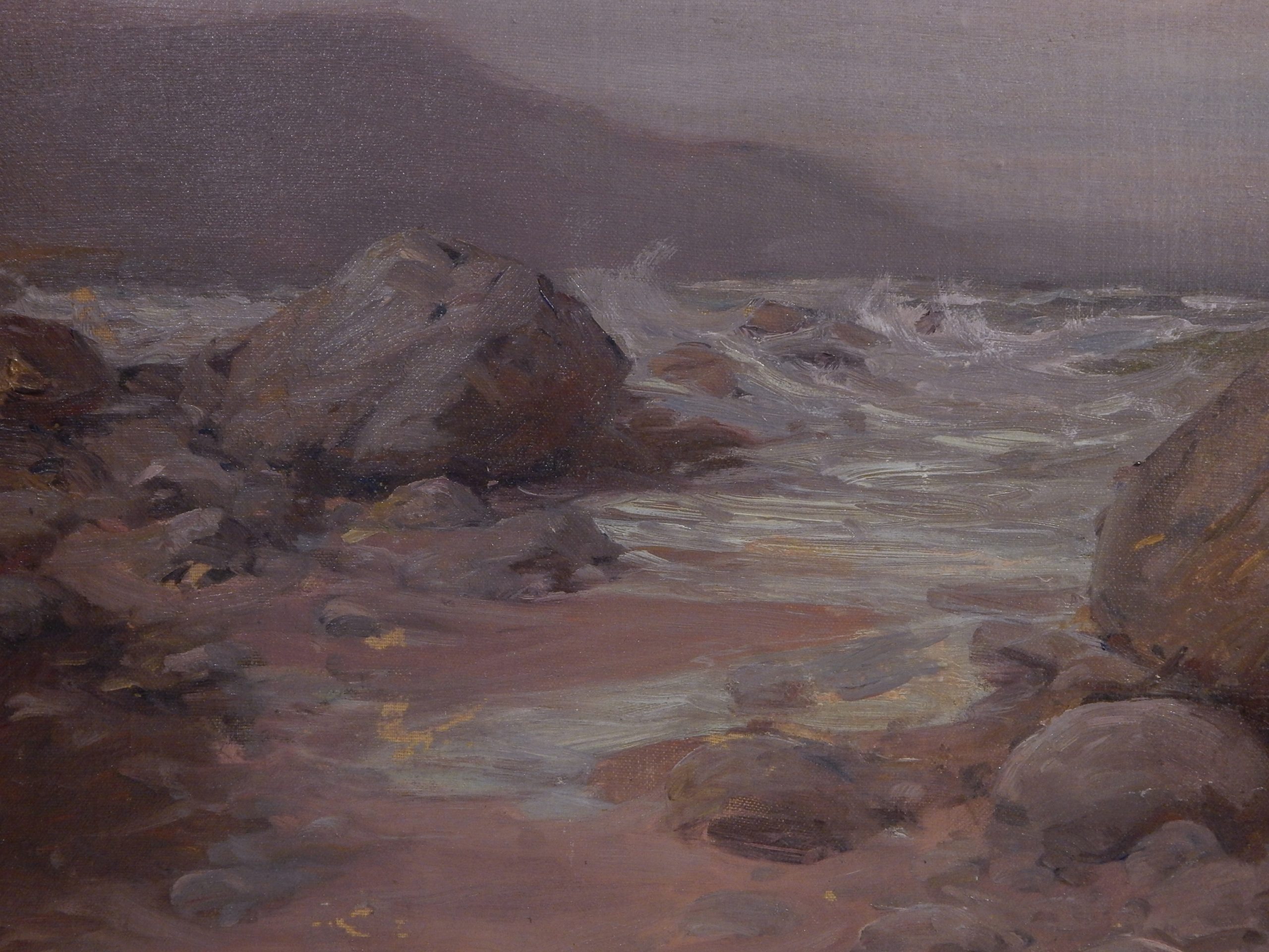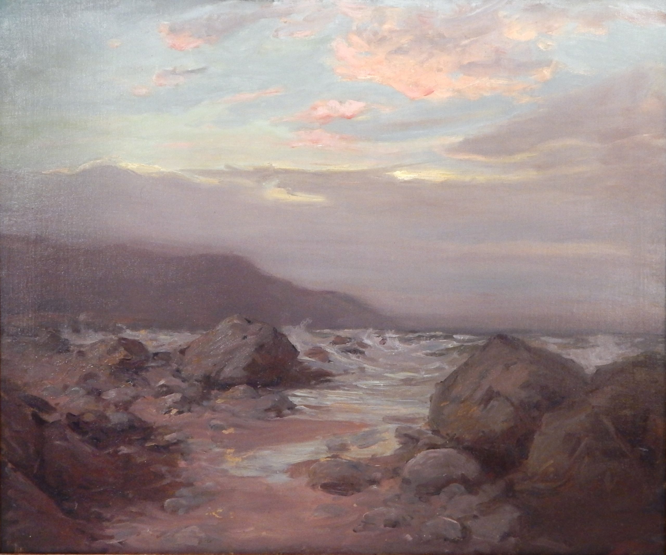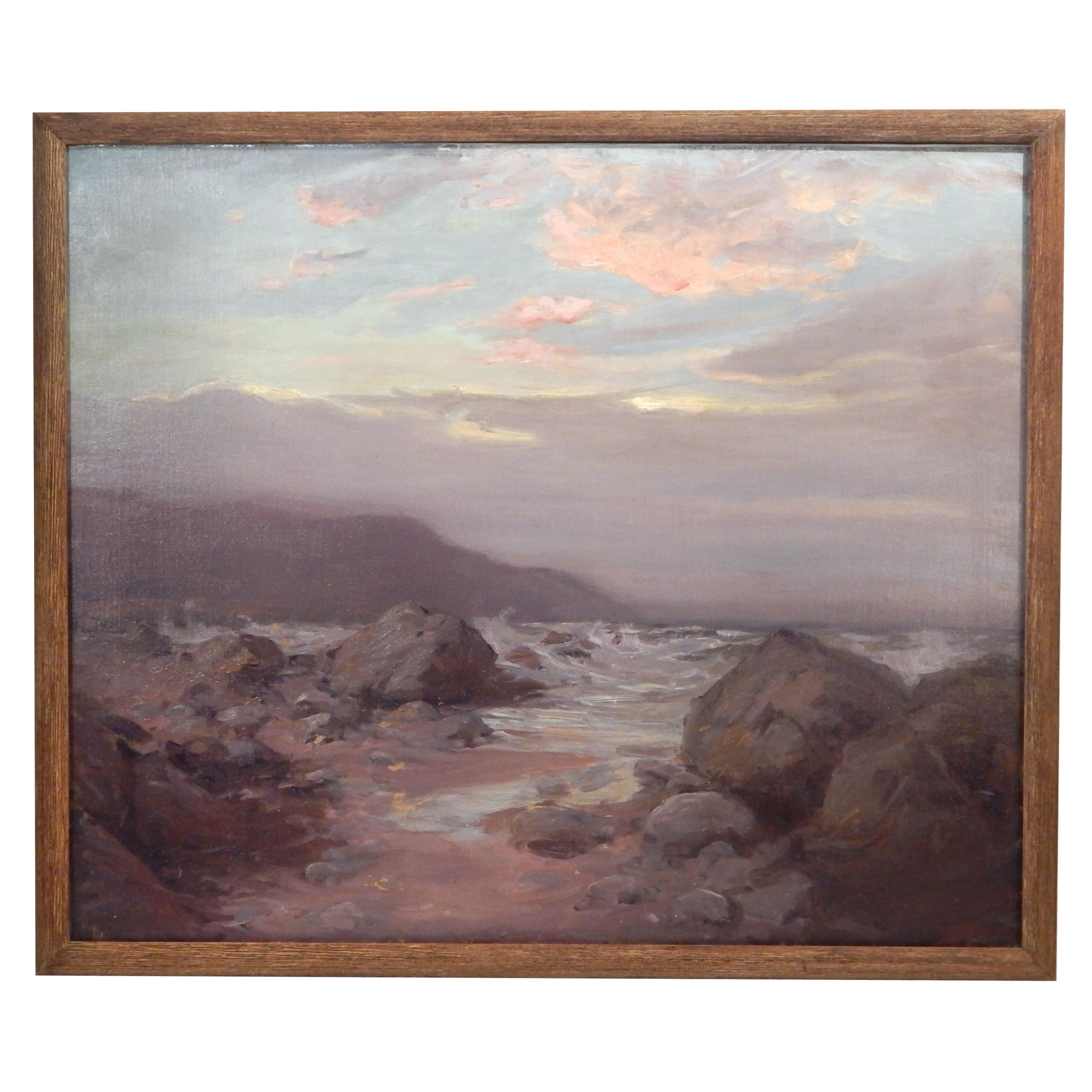 Large Seascape Featuring a Rocky Shore & Cotton Candy Sky By Hal Robinson
