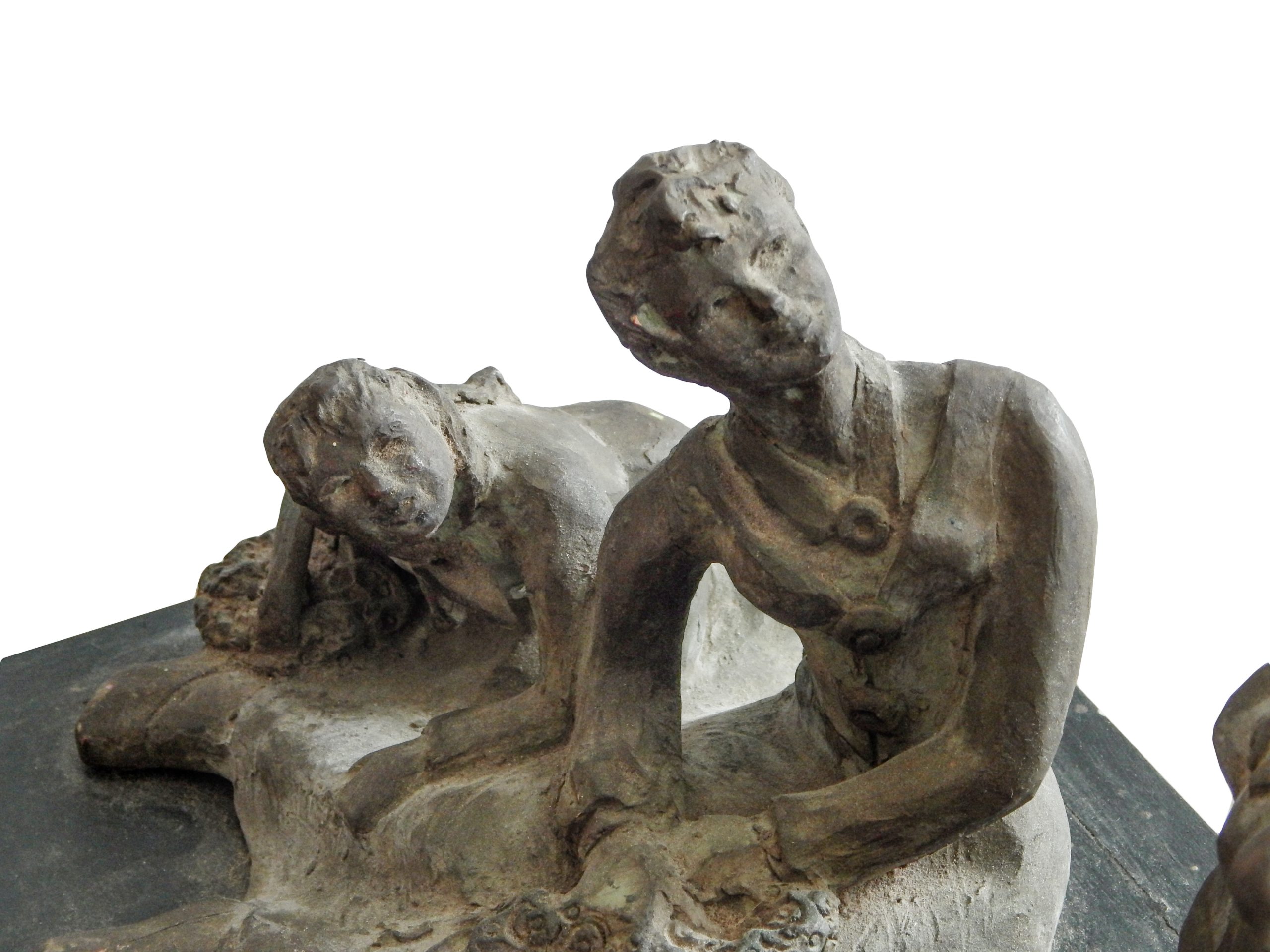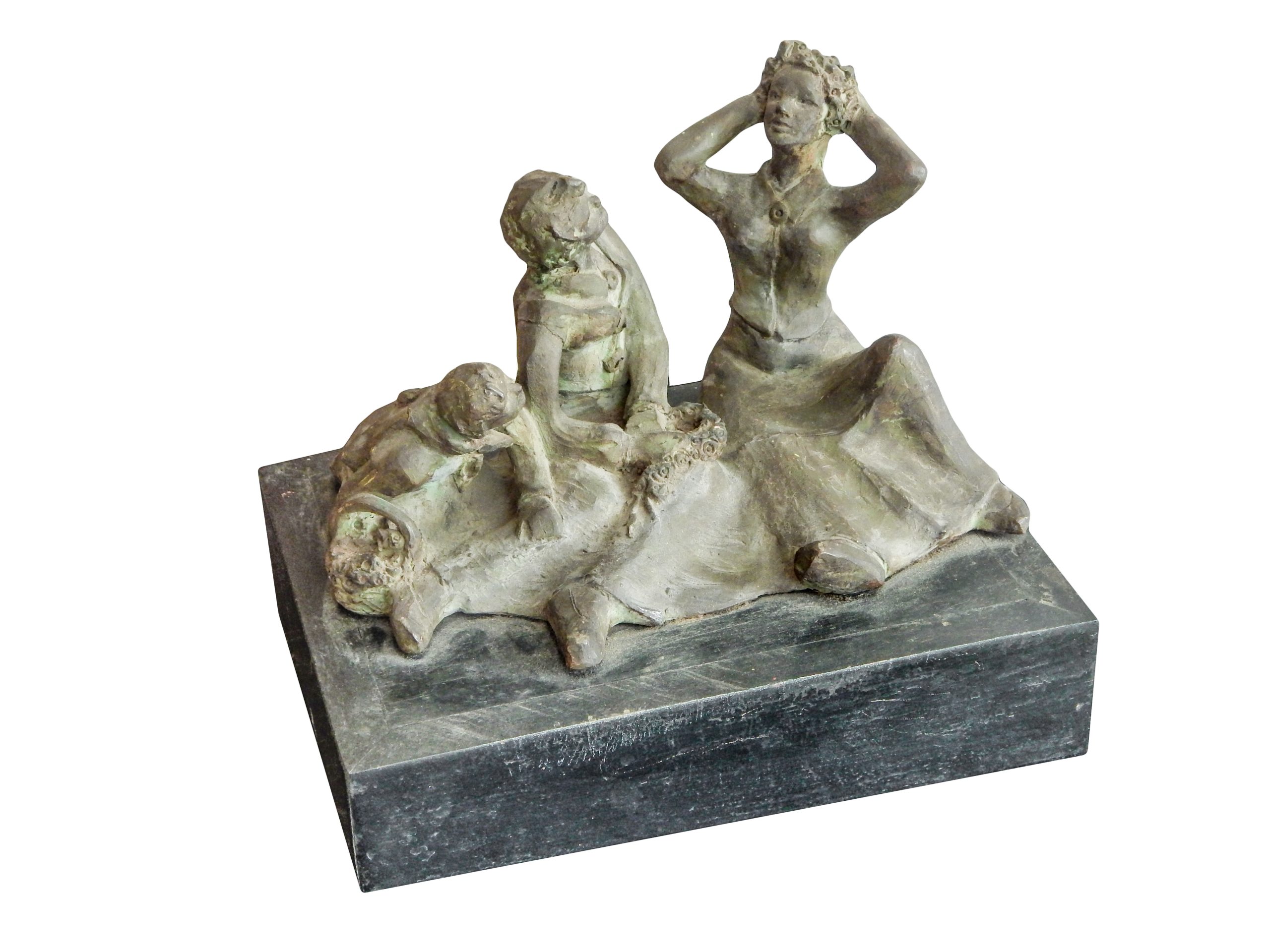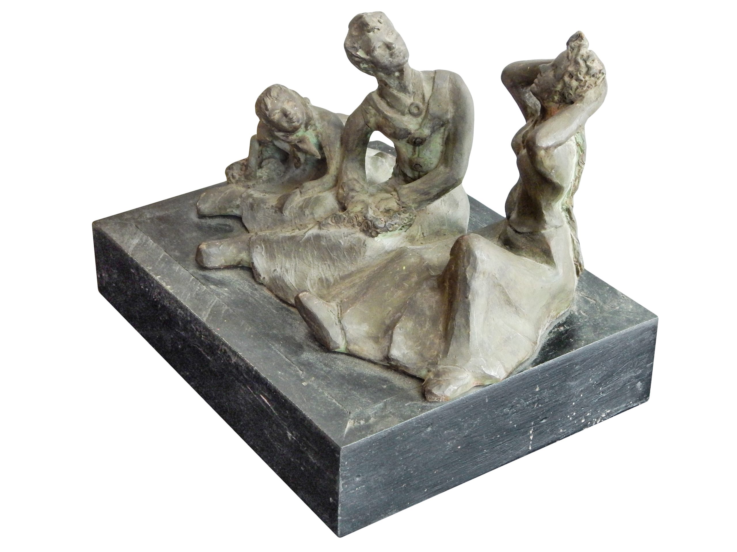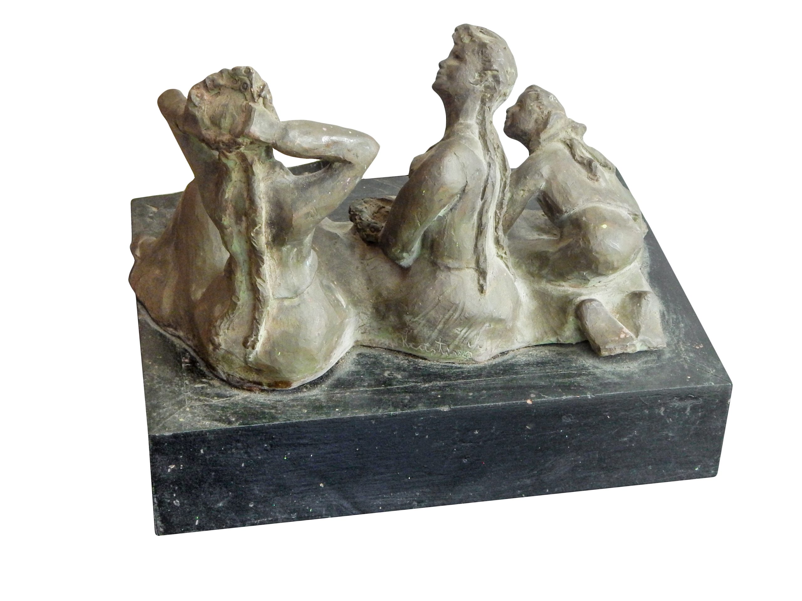 Clay Sculpture of Three Seated Ladies in Dresses Mounted on Wood Base