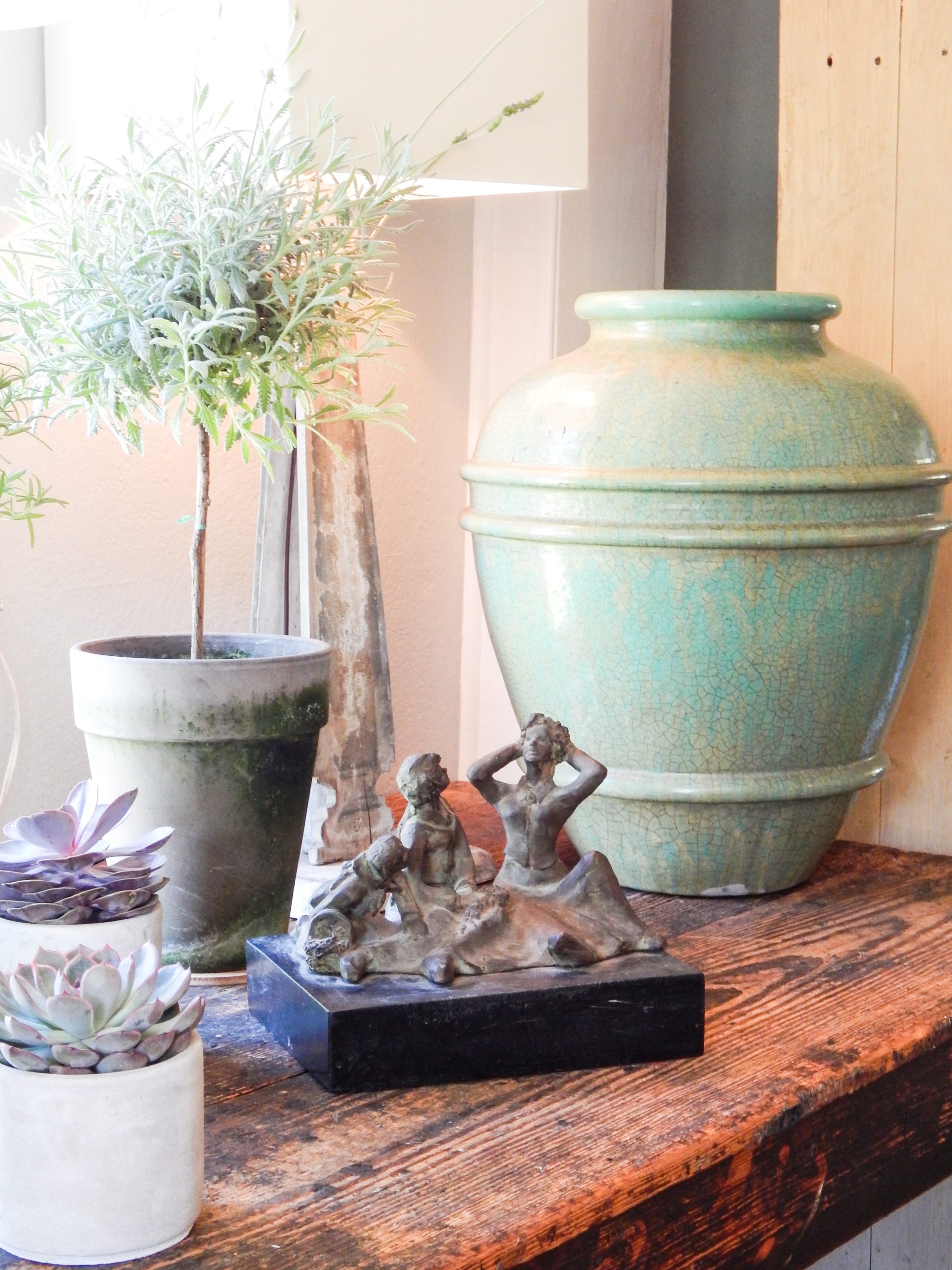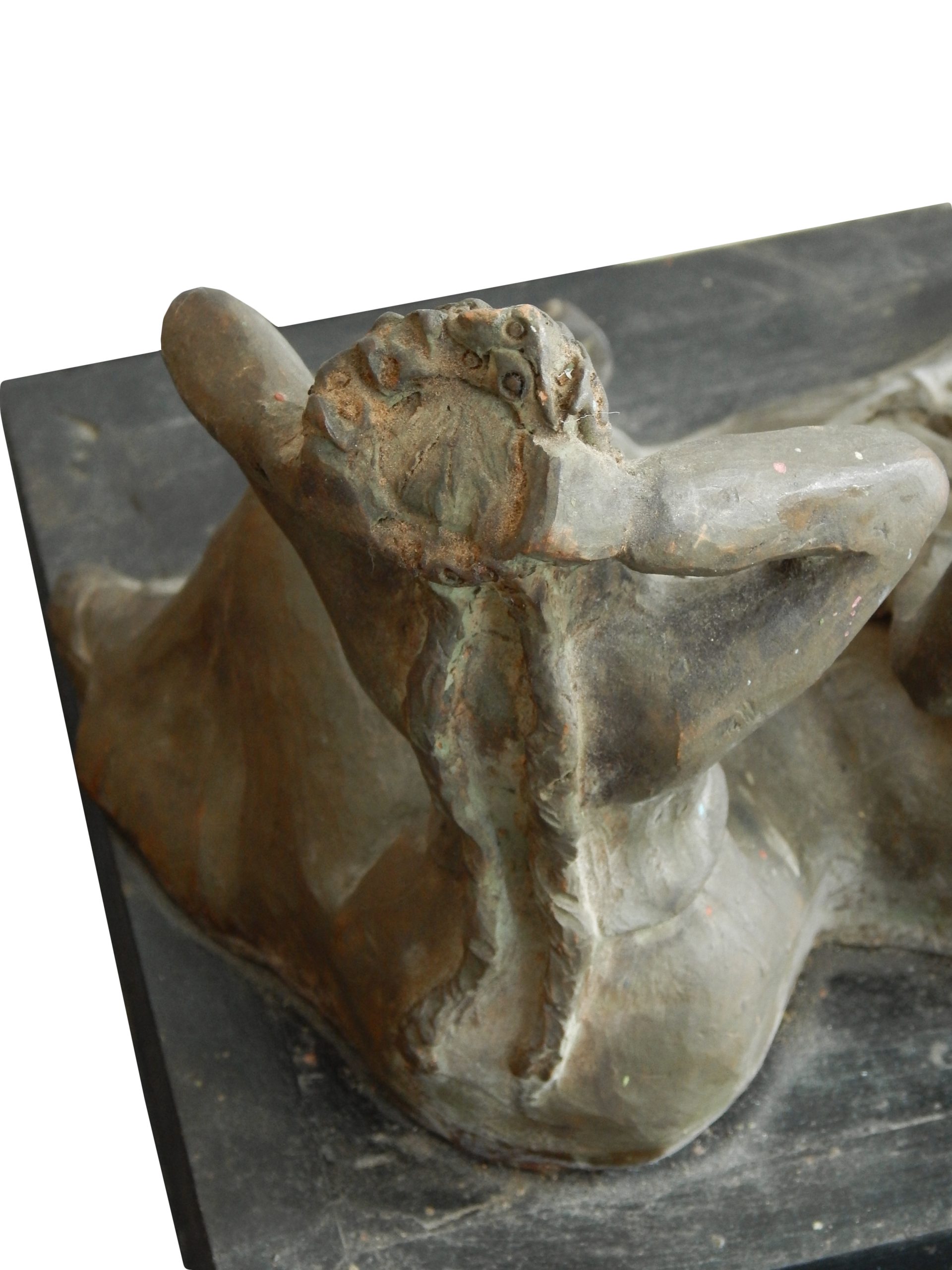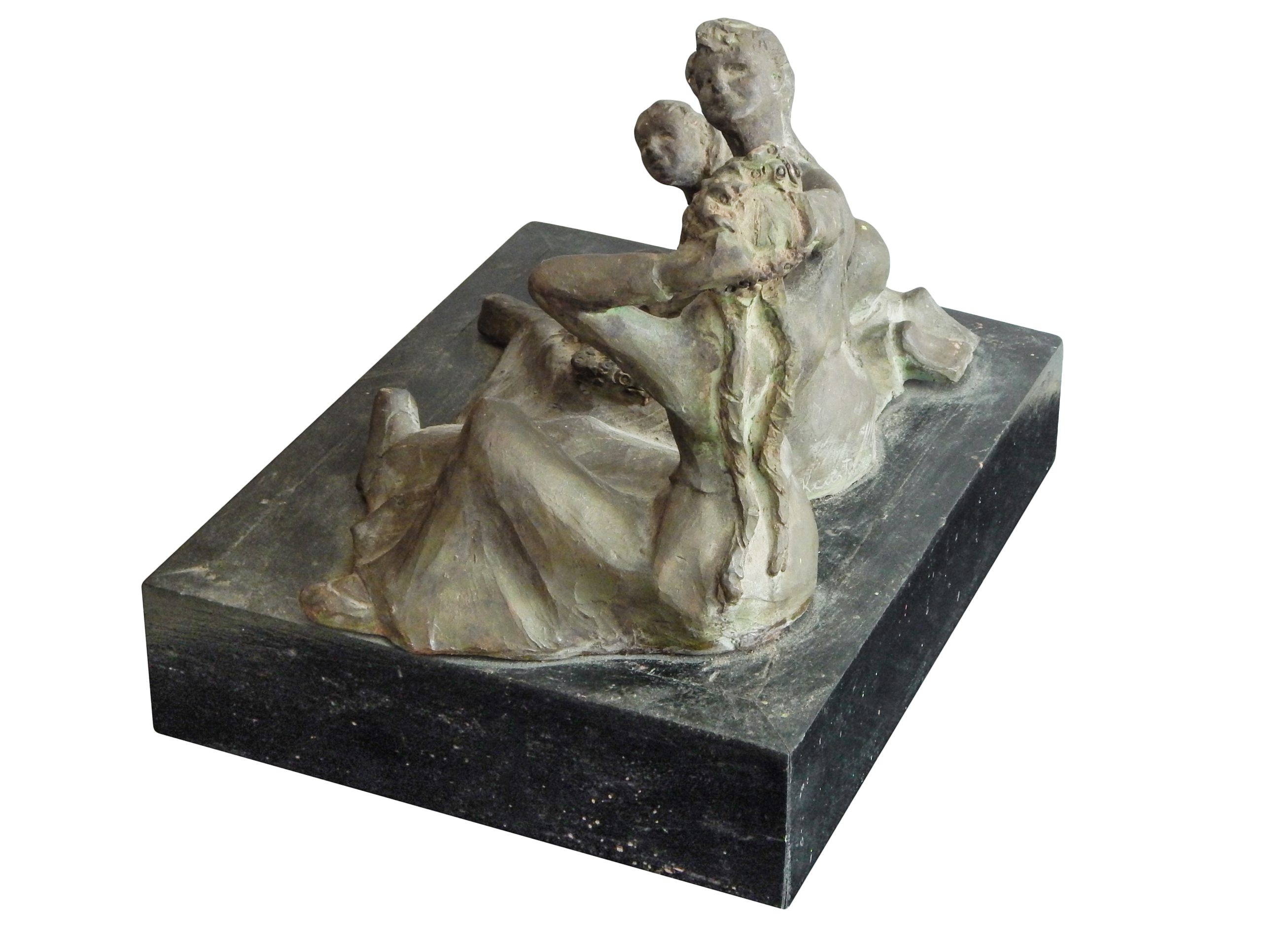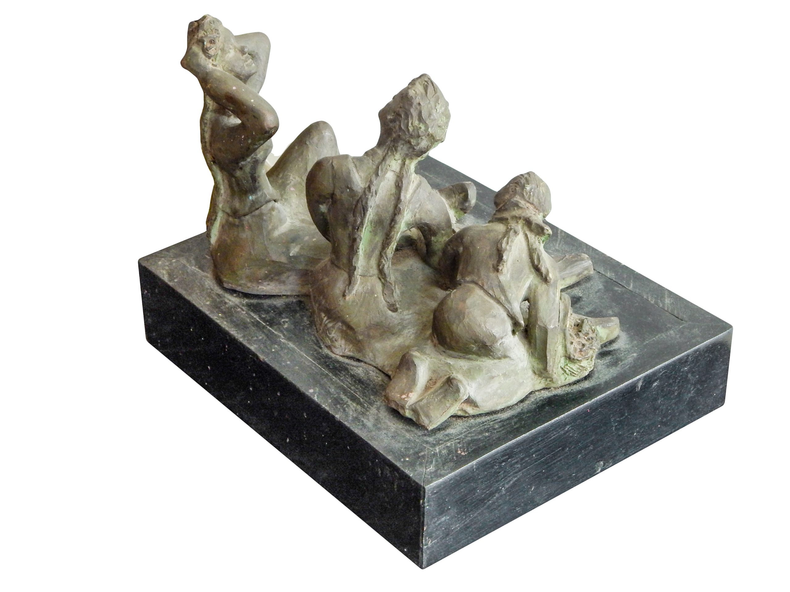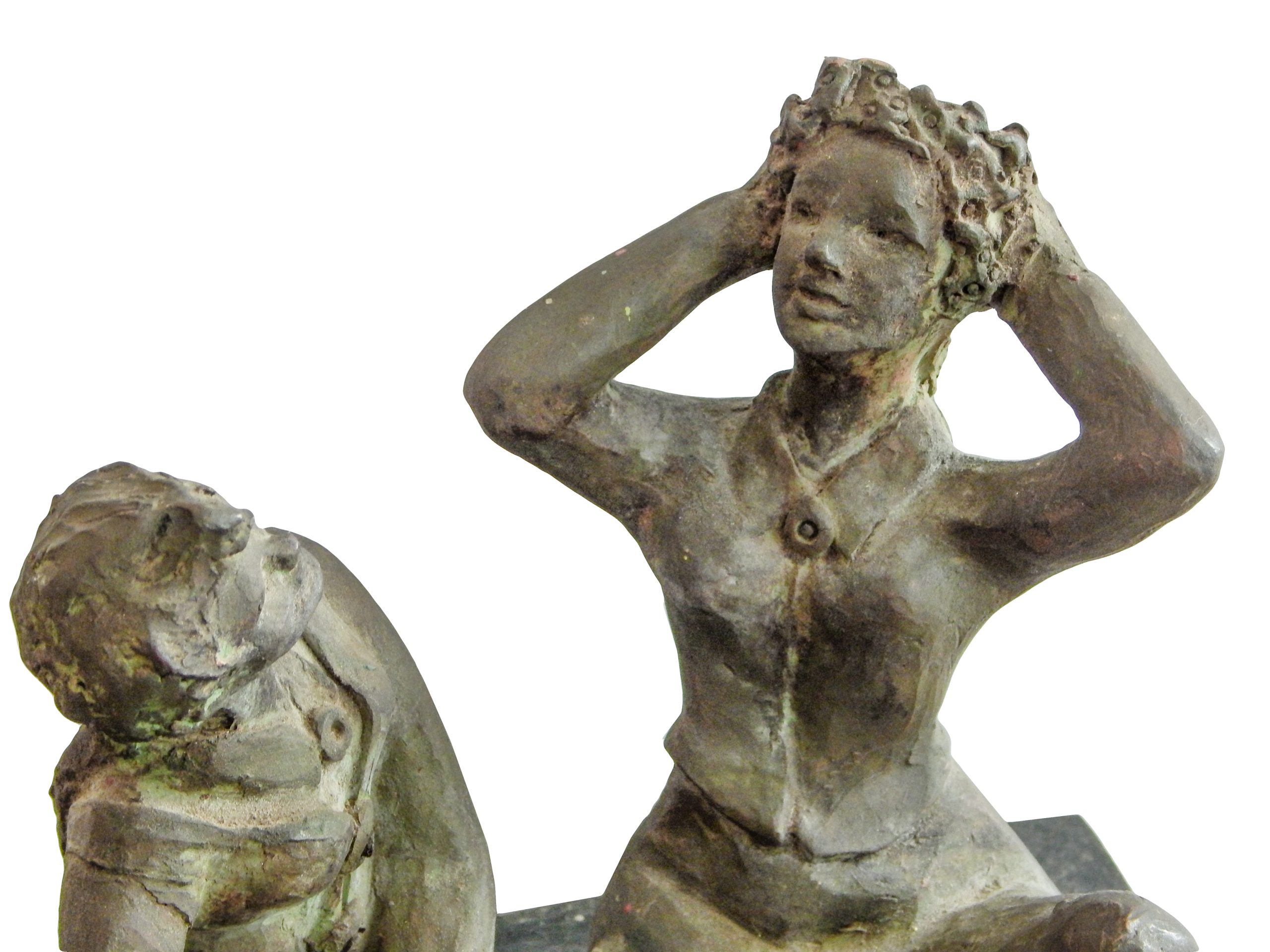 Clay Sculpture of Three Seated Ladies in Dresses Mounted on Wood Base